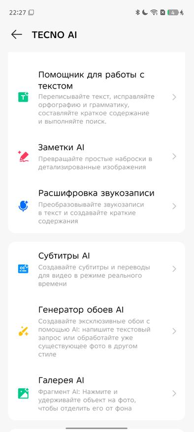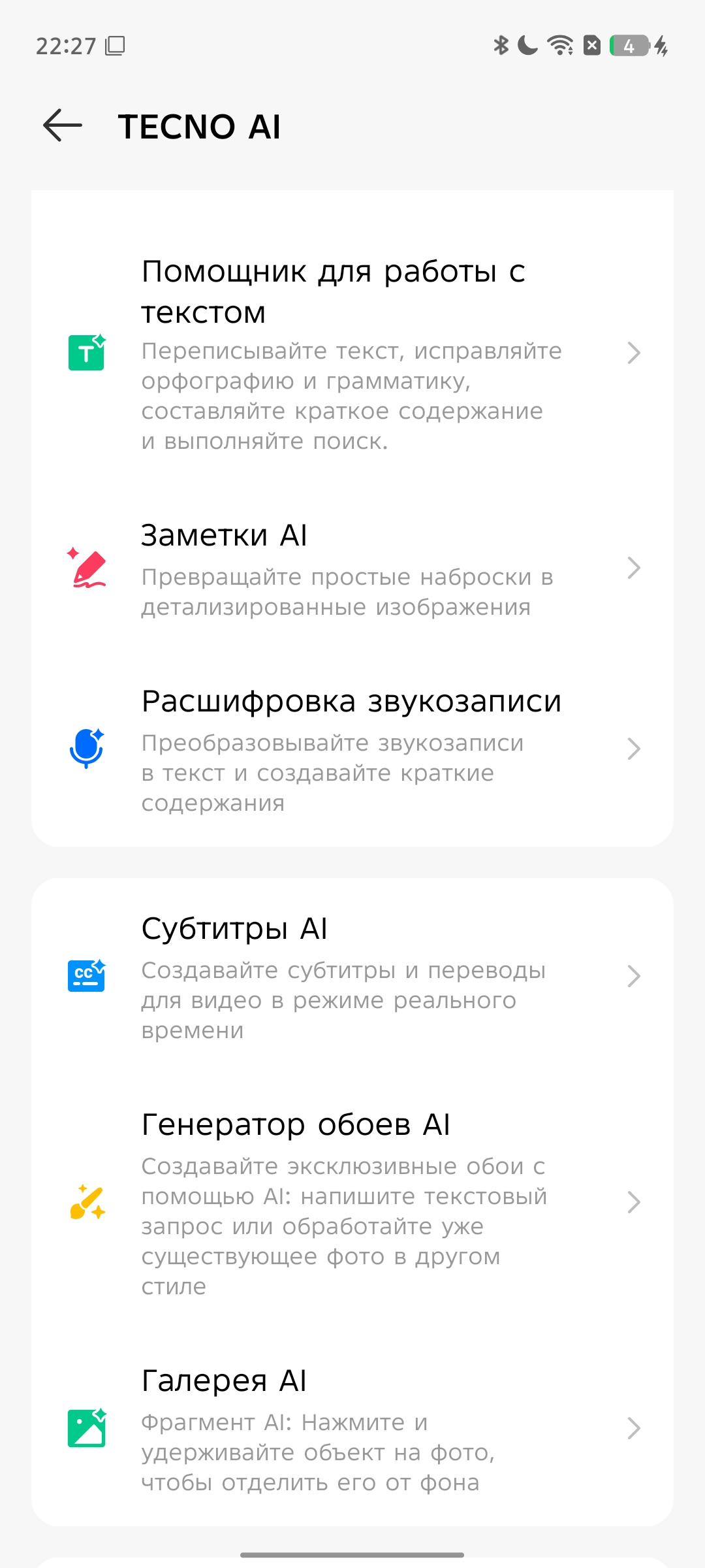 TECNO Spark 40 Pro работает под управлением Android 15 с фирменной оболочкой HiOS 15.1.2. Последняя получила ряд AI-улучшений, значительно упрощающих использование смартфона: интеллектуальное шумоподавление, встроенный ассистент Ella на основе DeepSeek-R1, функции для работы с галереей (ластик для удаления ненужных объектов, расширитель изображения, дорисовывающий кадр, корректировка светотени, поиск фрагментов с экрана и другие).