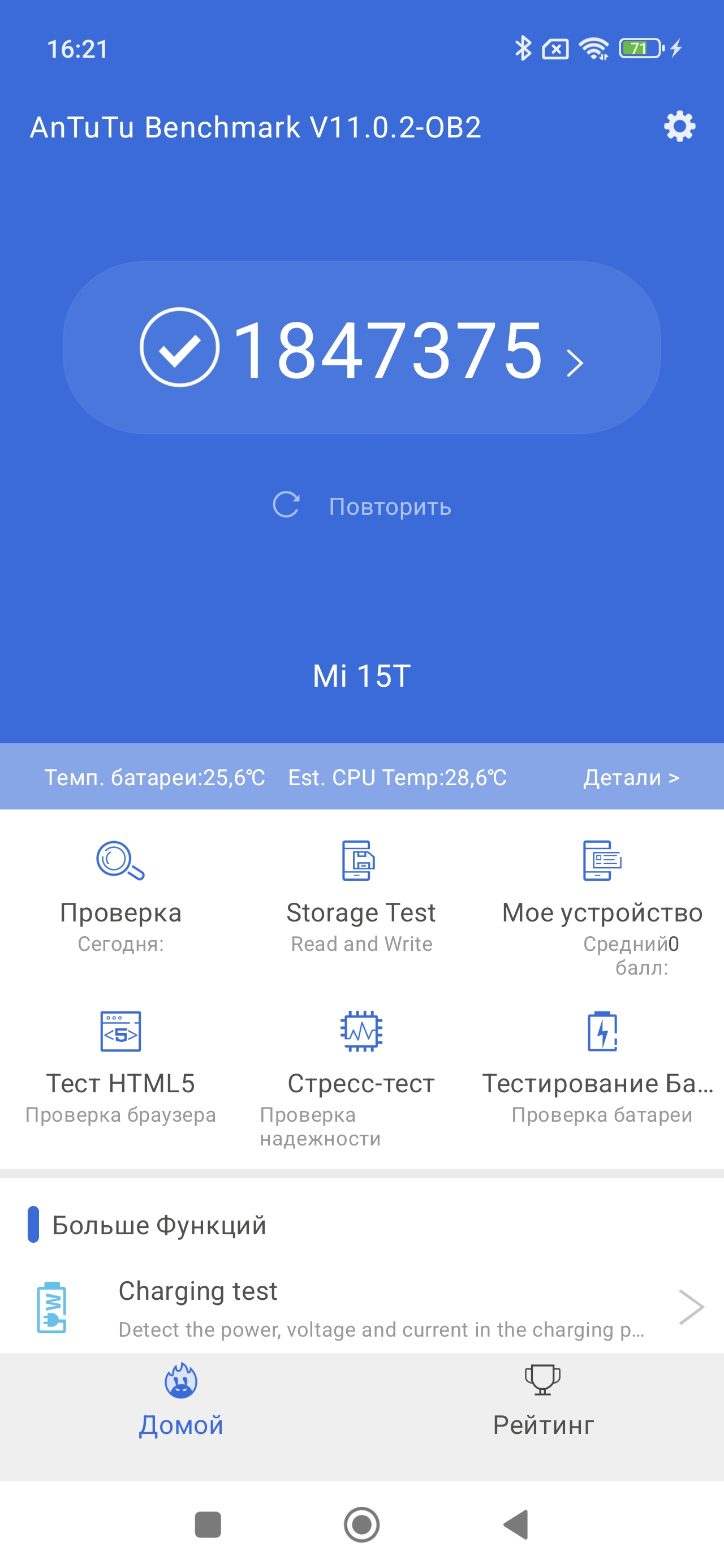 Благодаря современному процессору, смартфон набирает более 1.8 млн очков в Antutu. Очень показательный тест, в котором можно сравнить с другими смартфонами. На предыдущей версии смартфона Xiaomi 14T с процессором предыдущего поколения MediaTek Dimensity 8300 Ultra результат был на 600-700 тысяч очков меньше. Значительный прирост в производительности.