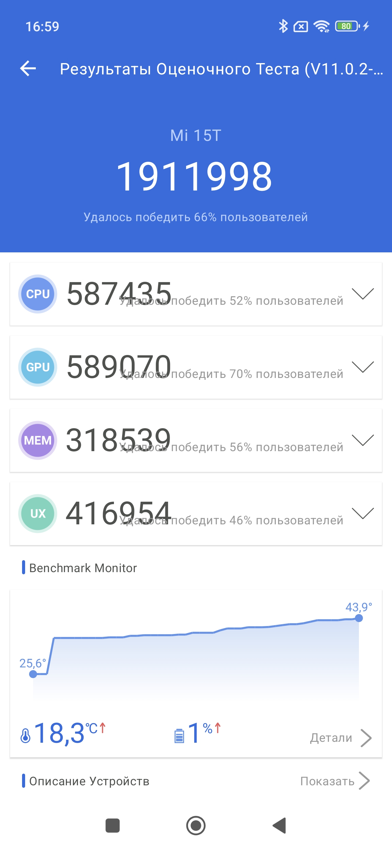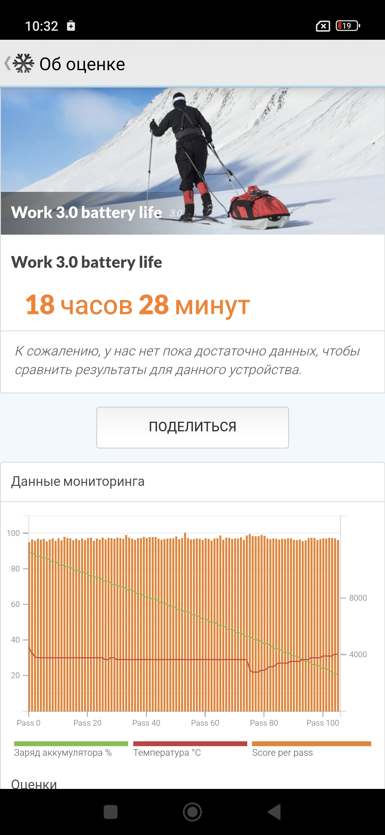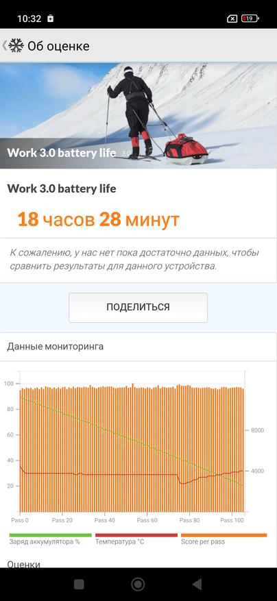 Автономность гаджета с аккумулятором на 5500 mAh составляет более 18 с половиной часов. Неплохой результат, если учитывать, что был включен средний уровень яркости. В играх будет чуть меньше.
