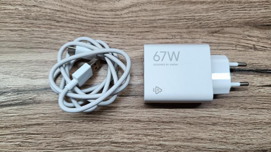 Фирменная картонная упаковка в белых тонах. Полная комплектация включает в себя защитный чехол боковых рамок и тыльной части, а также блок зарядки с кабелем. Зарядка ограничена мощностью в 67 Вт.
