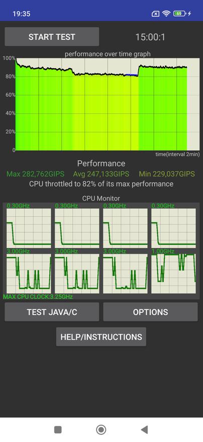 Проведенный троттлинг тест смартфона длительностью 15 минут показал максимальное значение GIPS на уровне 283. Сильных провалов в производительности или нагрев корпуса не зафиксирован.