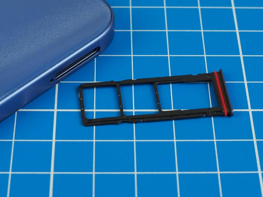 Смартфон получился крупным и грузным, какое-то время к нему придётся привыкать. Корпус, разумеется, «цельнопластиковый». Снизу расположились микрофон, динамик, 3,5-мм разъём и порт Type-C. Справа можно увидеть стандартный набор кнопок, слева — лоток для трёх карт (2 x NanoSIM + MicroSD). Верхняя грань пустует. Встроенный в клавишу питания сканер отпечатков пальцев отрабатывает быстро и точно, проблем с ним нет. Есть символическая защита от брызг по стандарту IP64. Попадание под дождик телефон выдержит, но не более того.