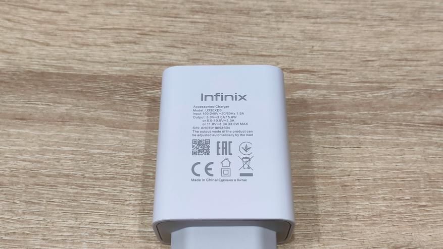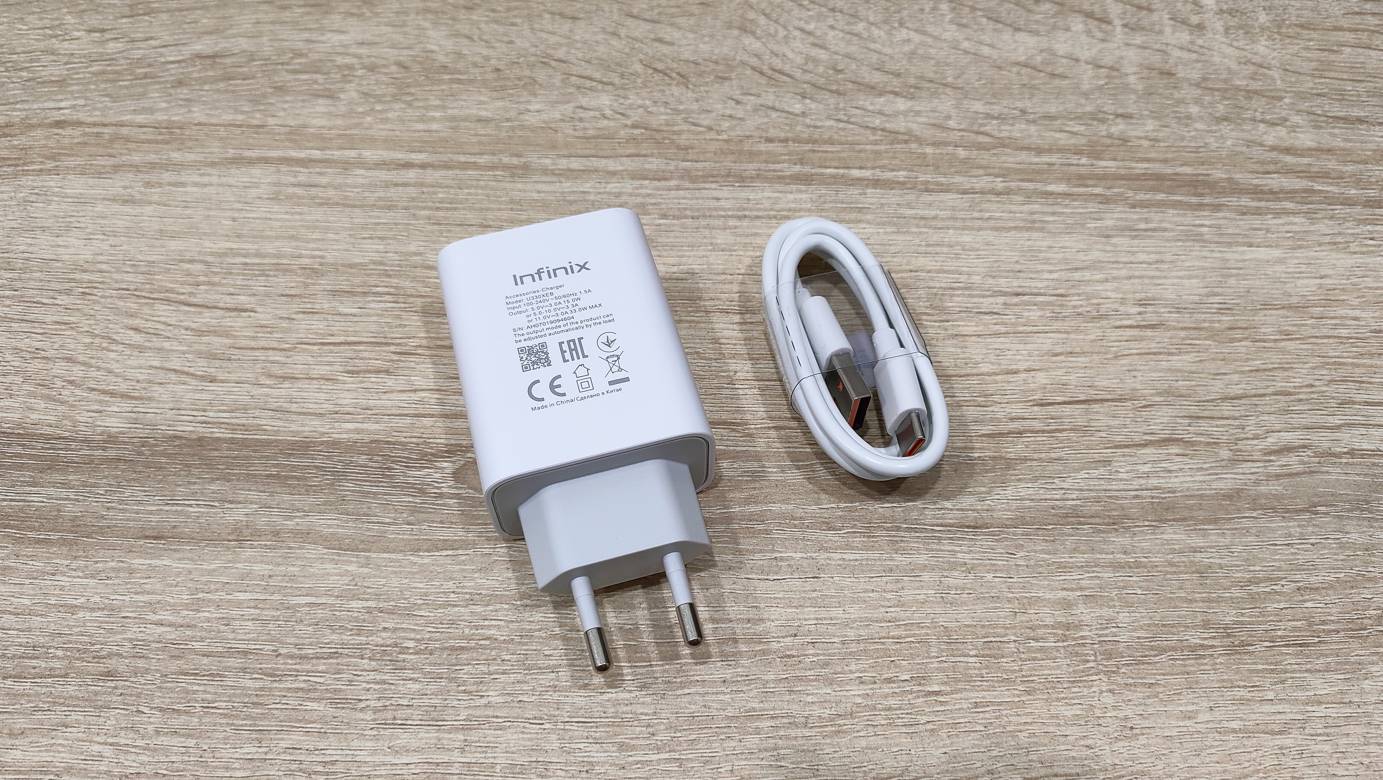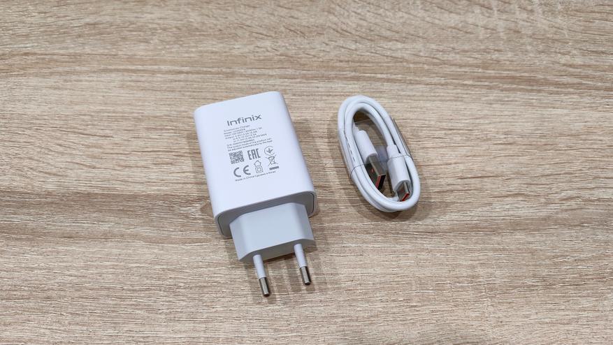 Зарядное устройство выдает 11 В и 3 А, что в сумме и даёт 33 Вт. Пока без тестов, непонятно какой протокол быстрой зарядки используется, но я попробовал подключить просто универсальное ЗУ с богатым набором протоколов и смартфон выдал заряд 33 Вт. Кабель обычный C-C, нет никаких хитрых пинов и прочей проприетарщины.