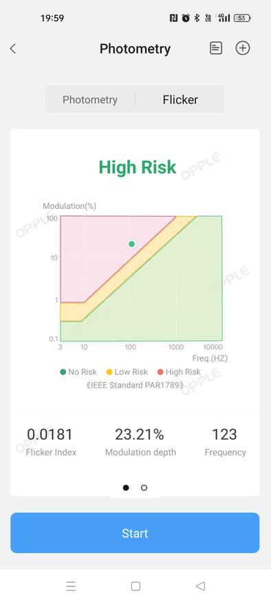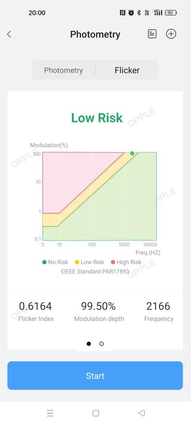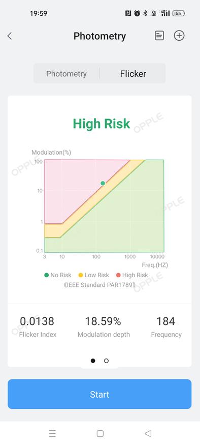 Лайтмастер фиксирует мерцание на частотах 120 и 180 на средней и максимальной яркости, но глубина мерцания далека, очень далеко от 99-100%, что делает его относительно безопасным. В любом случае, около часа непрерывного использования смартфона, дискомфорта в глазах или голове не обнаружено.