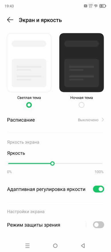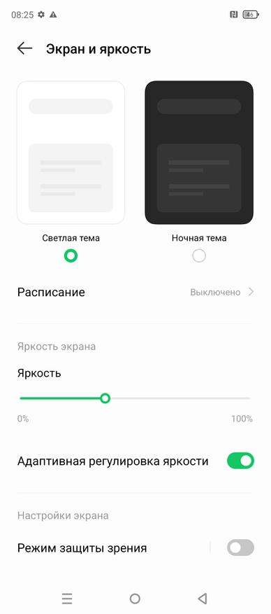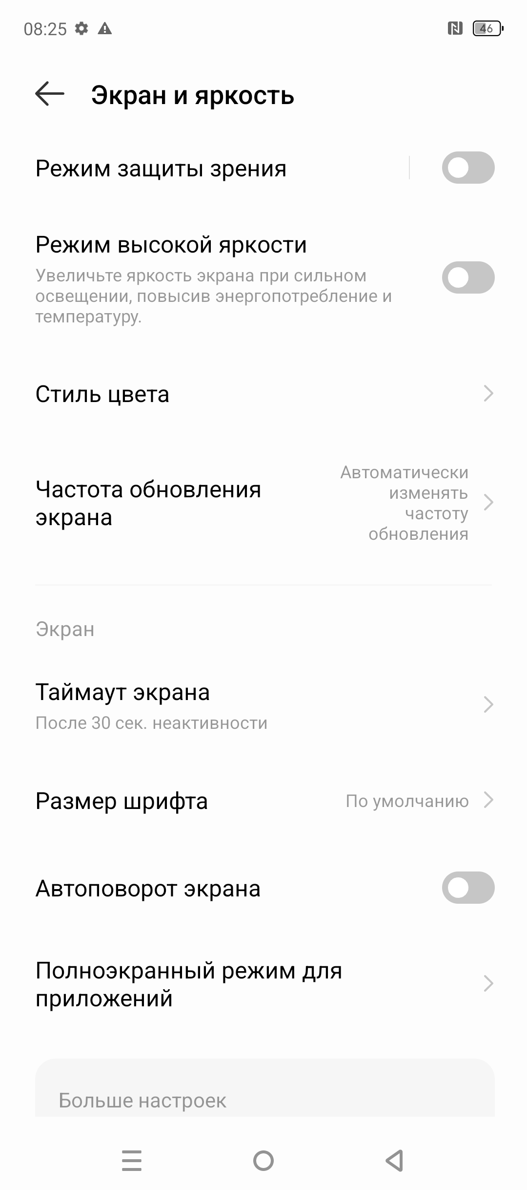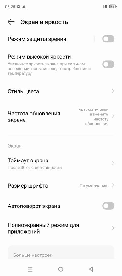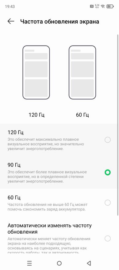 Это классические ступени 60/90/120 Гц и автоматический режим. Последний вариант означает, что смартфон выбирает определенную частоту для сценария, в играх, например, максимальную, для плавной картинки. Кроме того экран позволяет настроить другие базовые параметры вроде температуры, а также режим защиты зрения, который обычно подразумевает настройку синего излучения.