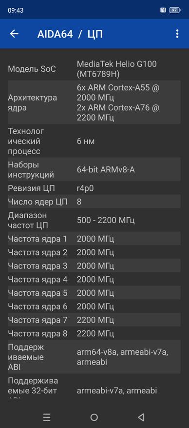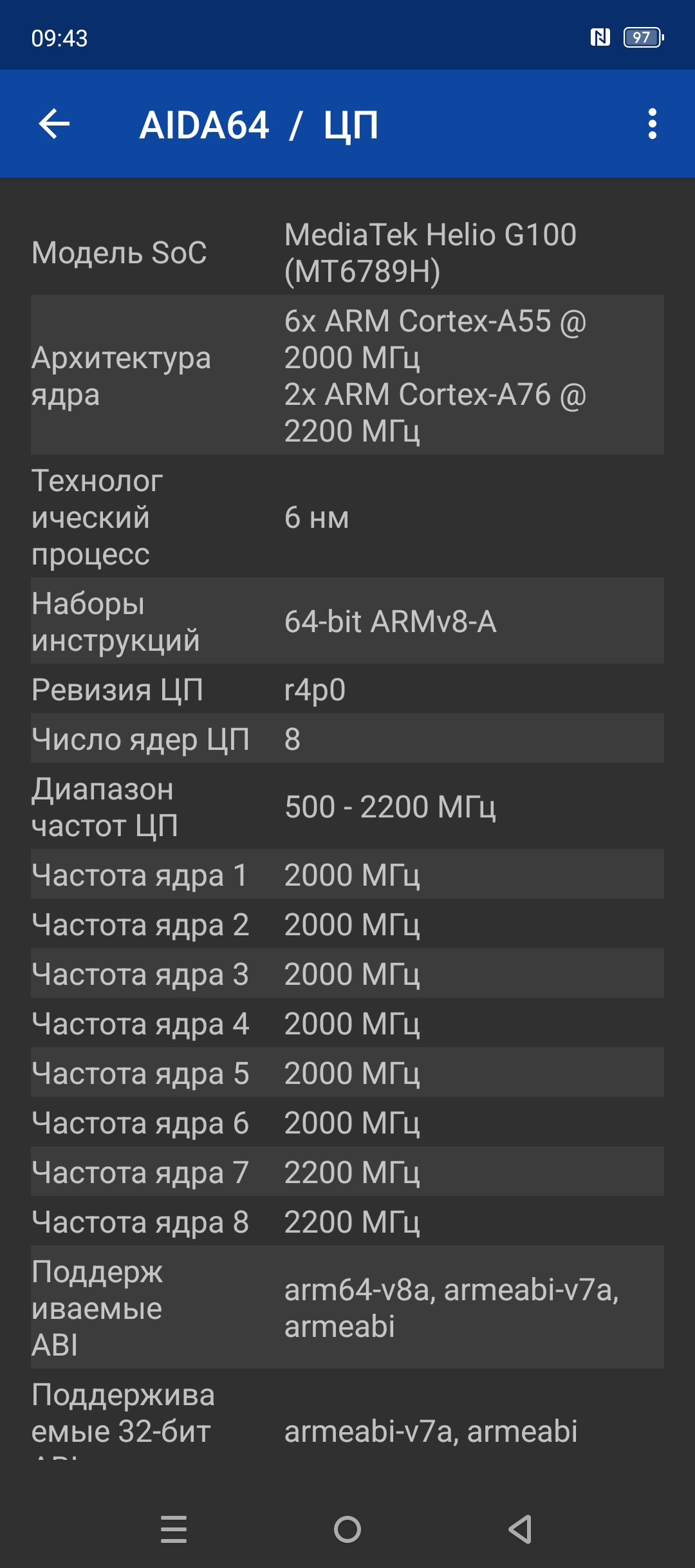 В основе смартфона лежит MediaTek Helio G100 — свежая модель для бюджетных и среднебюджетных устройств, которая получила эволюционные улучшения, чтобы идти в ногу со временем, т.к. с момента предыдущего G99, прошло два года, а камеры за это время изрядно подтянулись. Процессор имеет 2 ядра Cortex-A76 на 2200 МГц и 6 ядер Cortex-A55 на 2000 МГц. За графику отвечает Mali G57 MC2. Объем оперативной памяти LPDDR4X равен 8 ГБ, с частотой 2133 МГц, который по-модному может быть расширен до 16-ти ГБ. Какой-нибудь Genshin Impact идет на минималках в 55-60 FPS, на средних в районе 40.