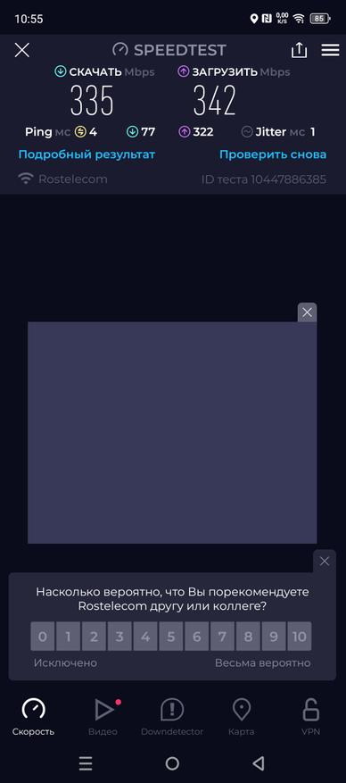 Проблем со связью нет, будь то сотовая, Wi-Fi, NFC или GPS. 5G в смартфоне нет, но передо мной недорогое устройство, хоть и не лишено фишек (взять хотя бы тонкий дизайн, на который производители по большей части забили), поэтому 5G здесь смотрелся бы, скорее, для галочки. А вот 4G здесь полноценный, включая поддержку VoLTE, а также в G100 заявлен «режим лифта», который помогает быстро восстановить связь, ведь она затруднена в тоннелях и лифтах. Скорость связи устройства давно перестала быть узким местом и почти всегда упирается в возможности сотовых операторов в конкретном месте тестирования.