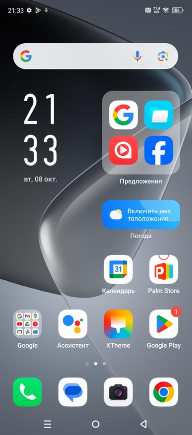 Свежему смартфону — свежая система, а именно, 14-я версия Android с фирменной оболочкой XOS 14.5.0. Настройки и интерфейс привычные и понятные, никаких сложностей в использовании не было, все на своих логичных местах. Рекламы не замечено. Зато можно записывать телефонные разговоры. Разблокировка смартфона может быть по отпечатку пальца (датчик находится под экраном в нижней его части), а также по лицу. На мой взгляд по отпечатку привычнее и быстрее, тем более, что датчик очень быстрый.