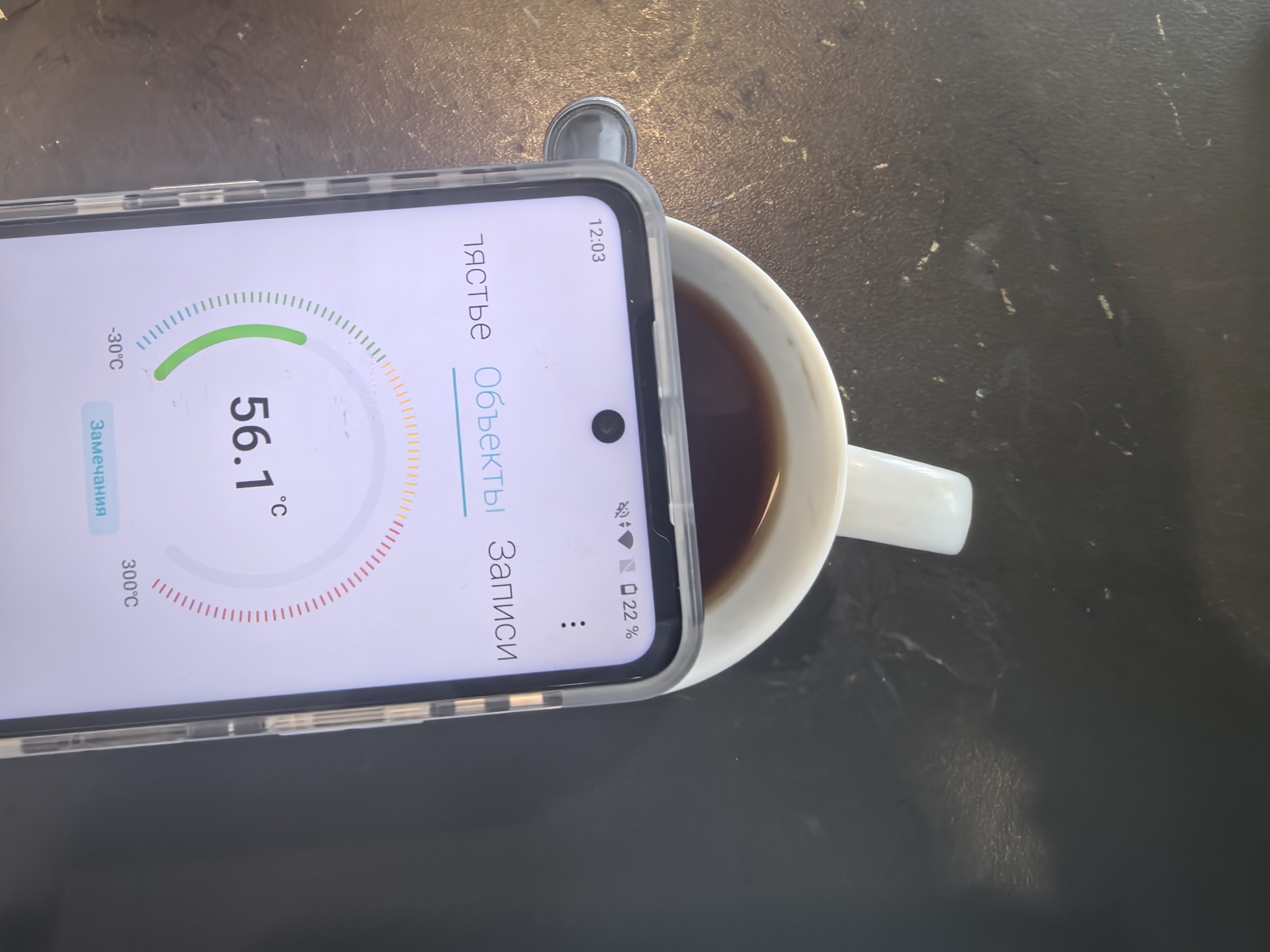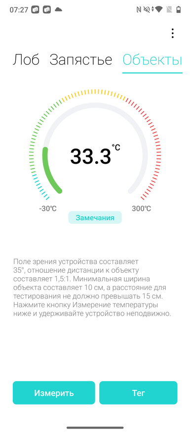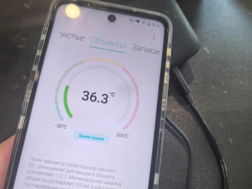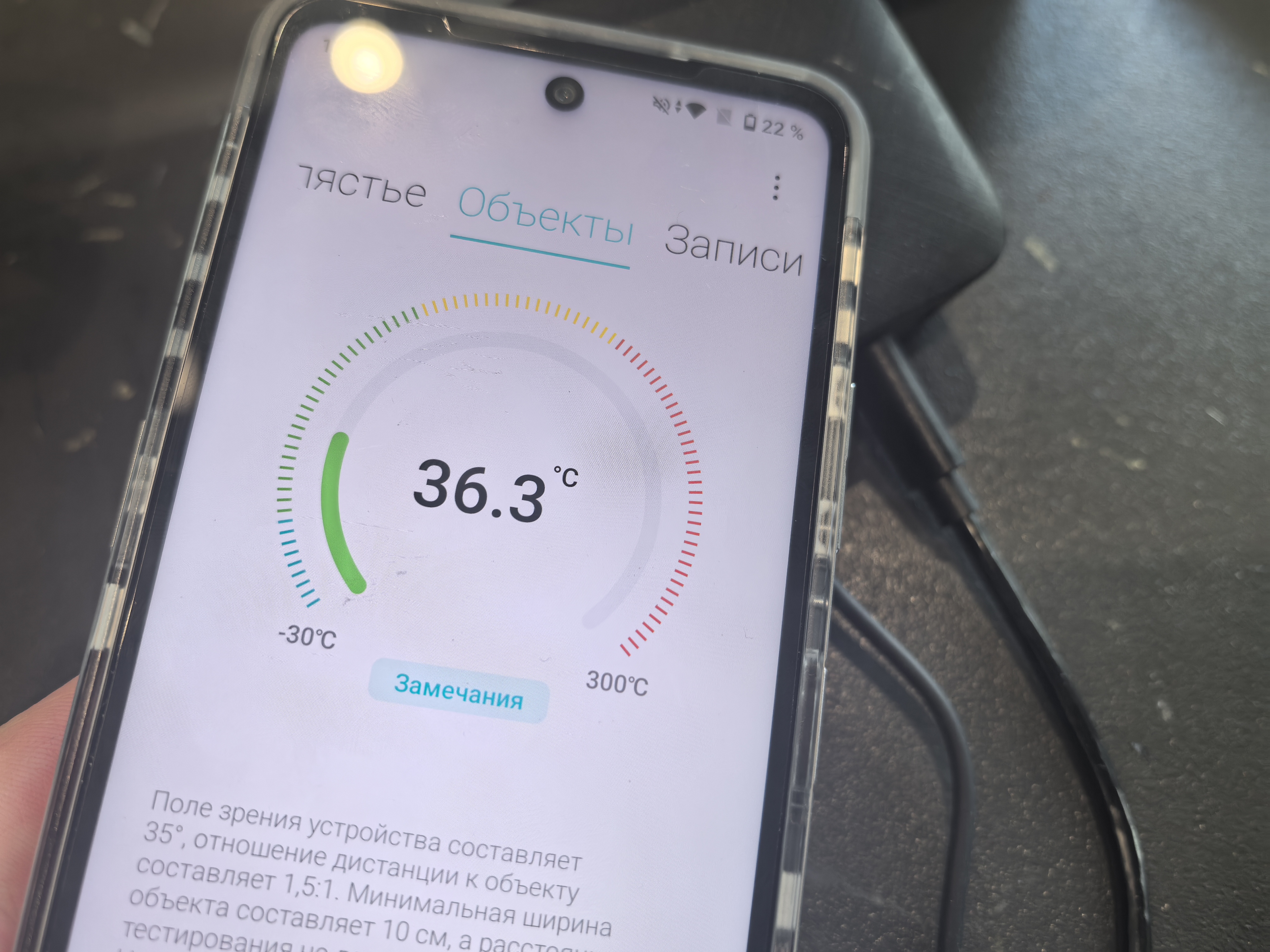 Диапазон определения температур — от -30°C до 300°C. Ниже показал измерение температуры в зависимости от предмета: горячей кружки, руки человека, зарядного устройства, металлической рамы.