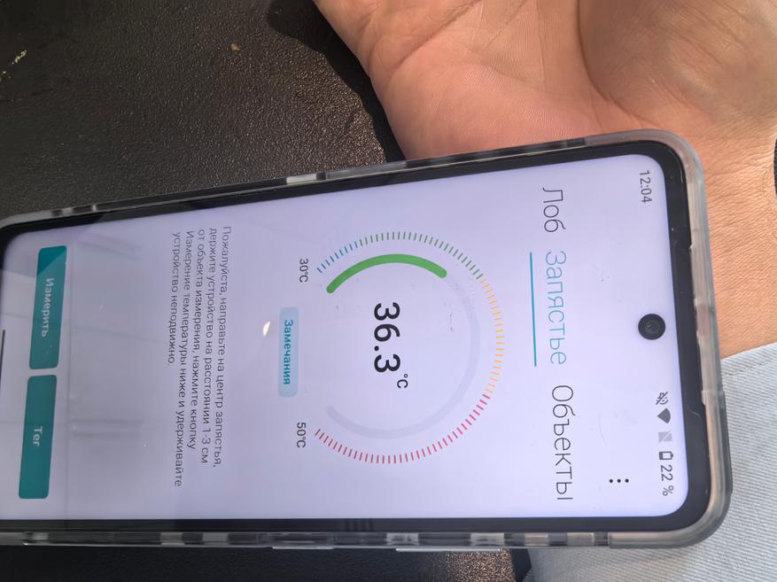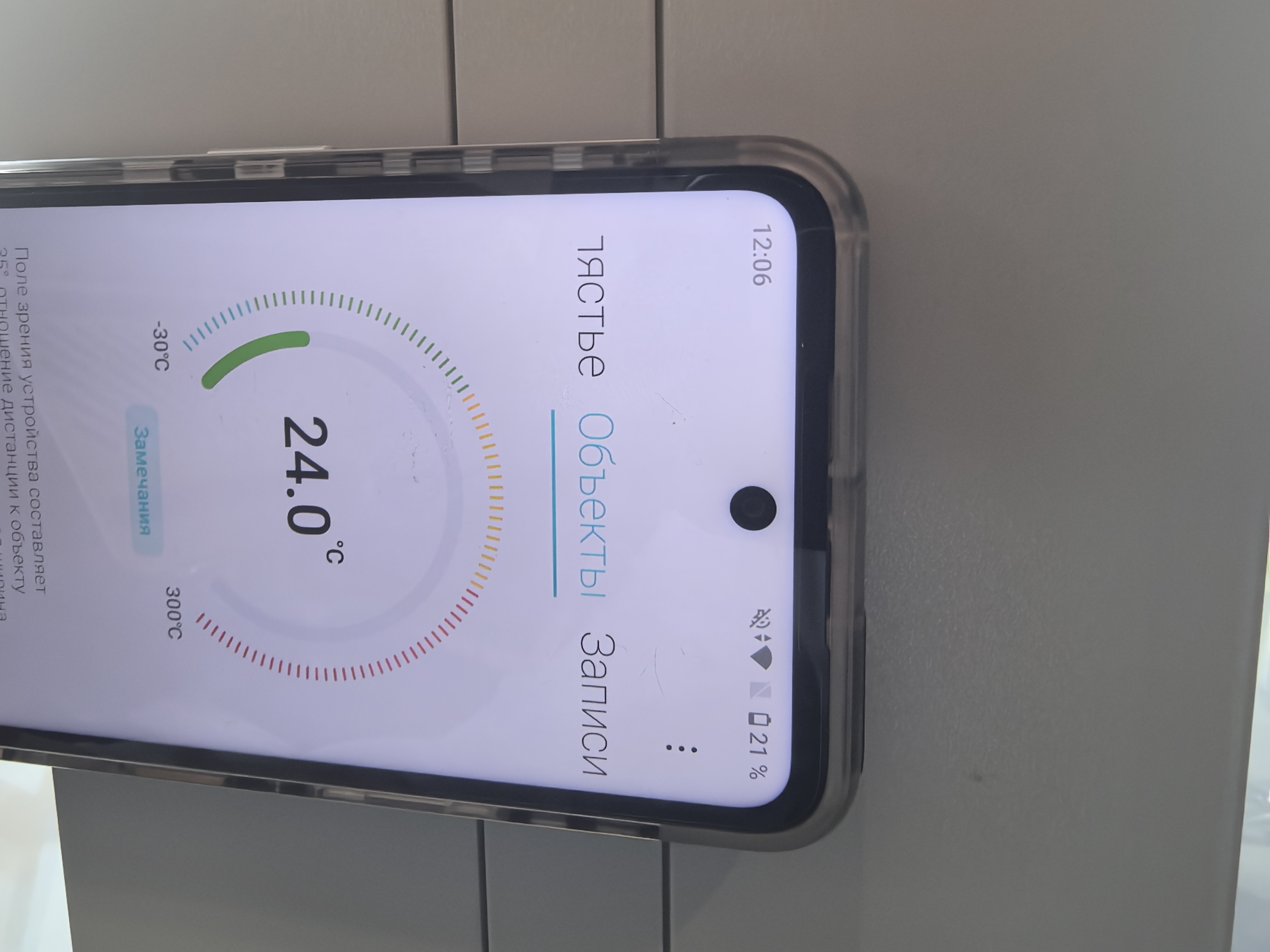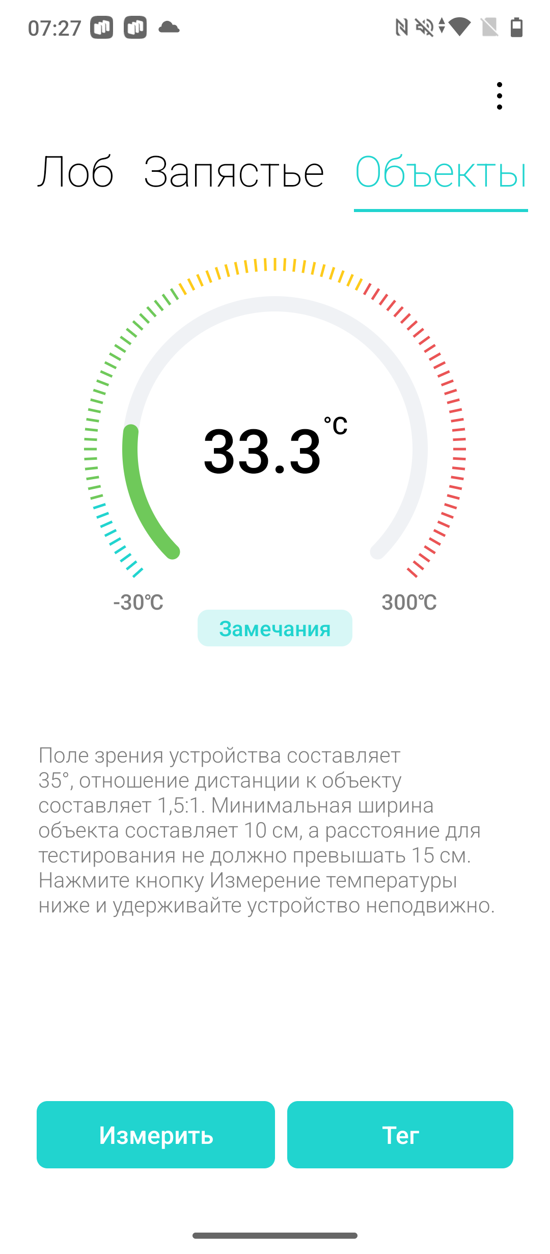 Диапазон определения температур — от -30°C до 300°C. Ниже показал измерение температуры в зависимости от предмета: горячей кружки, руки человека, зарядного устройства, металлической рамы.