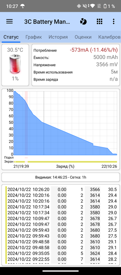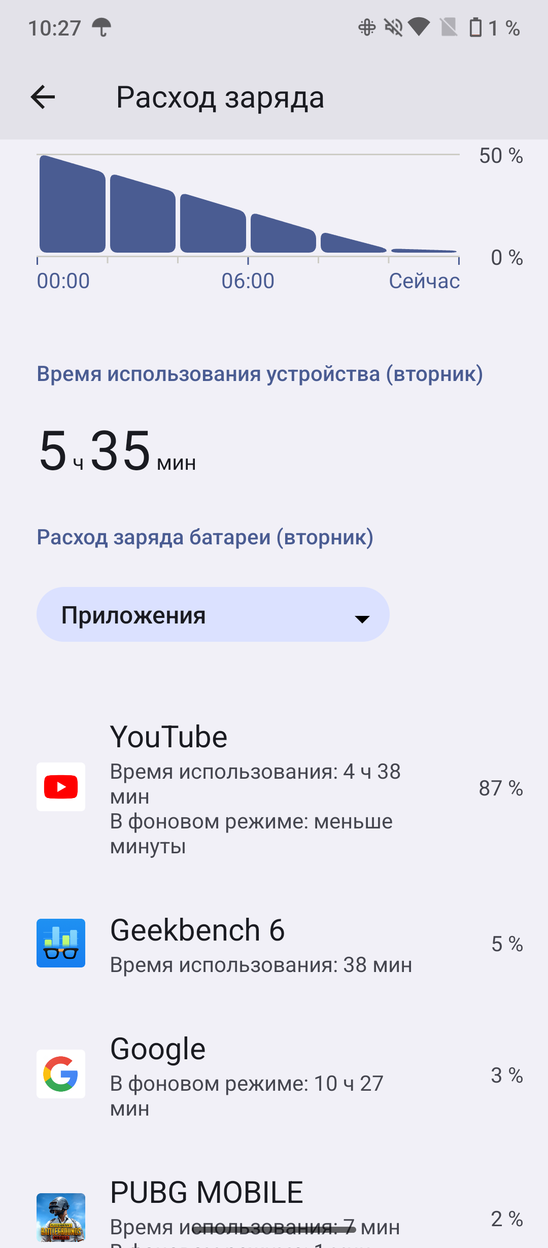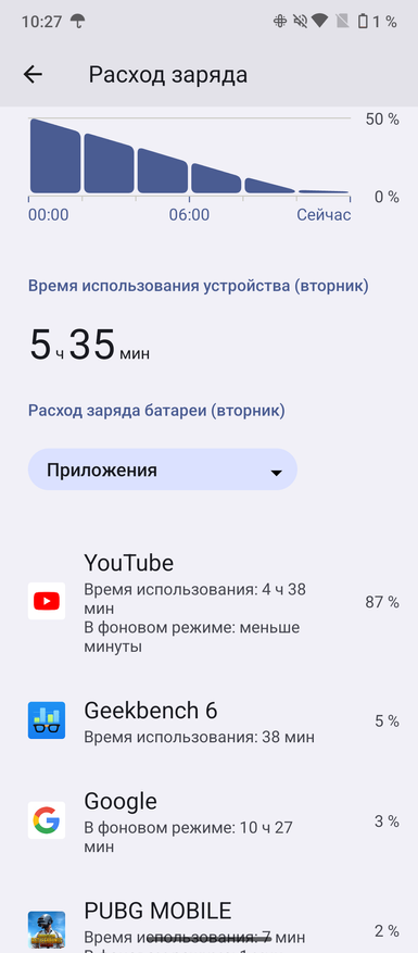 Ниже показал, как происходил разряд AGM X6 Phantom. На втором скриншоте представлена разбивка второго дня с 50%. Экстраполируя время, потраченное на YouTube, получается, что 100% хватит на 15-17 ч (4,5 ч в этот день и 1,5 ч в предыдущий, не показано). На первом скриншоте видно, что активный экран составил практически 15 ч.
