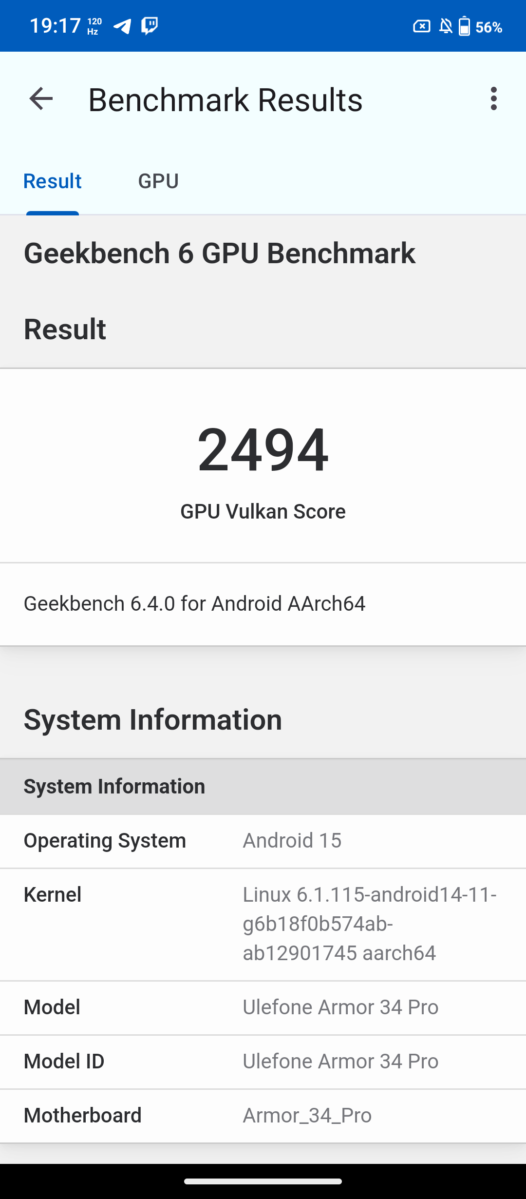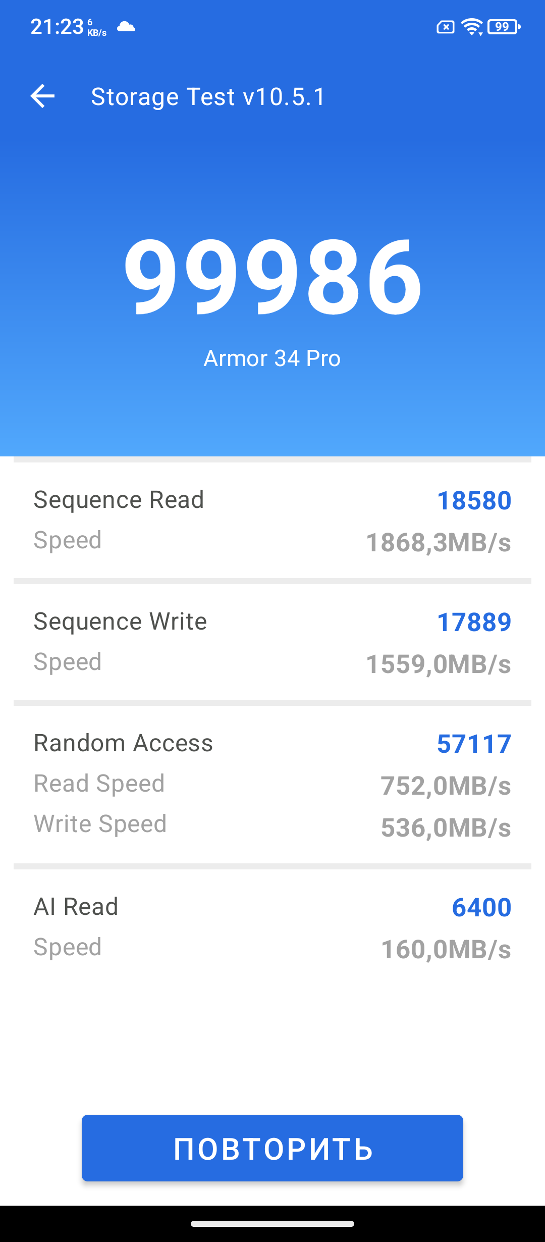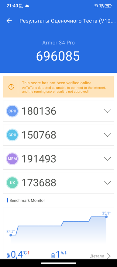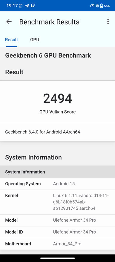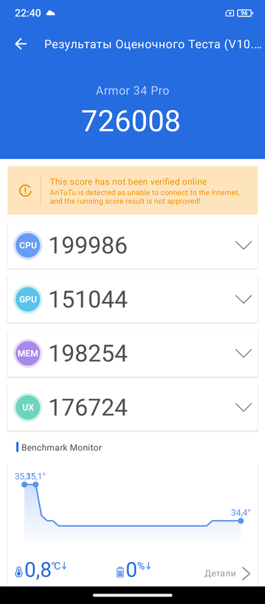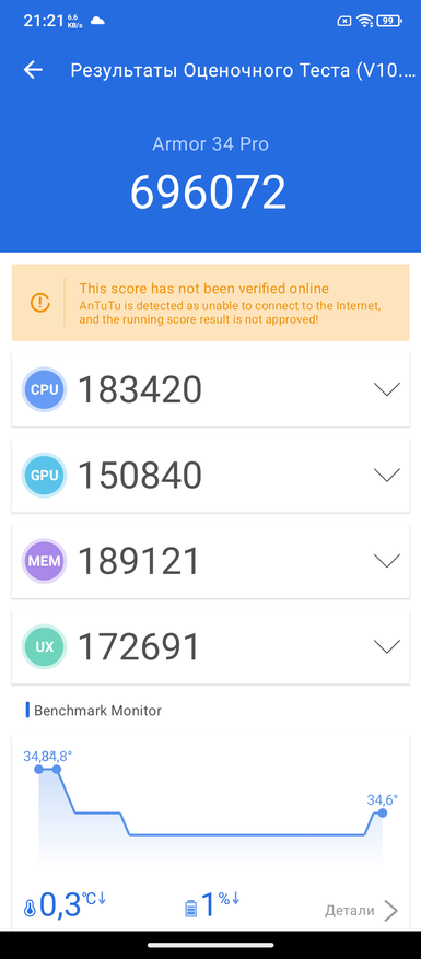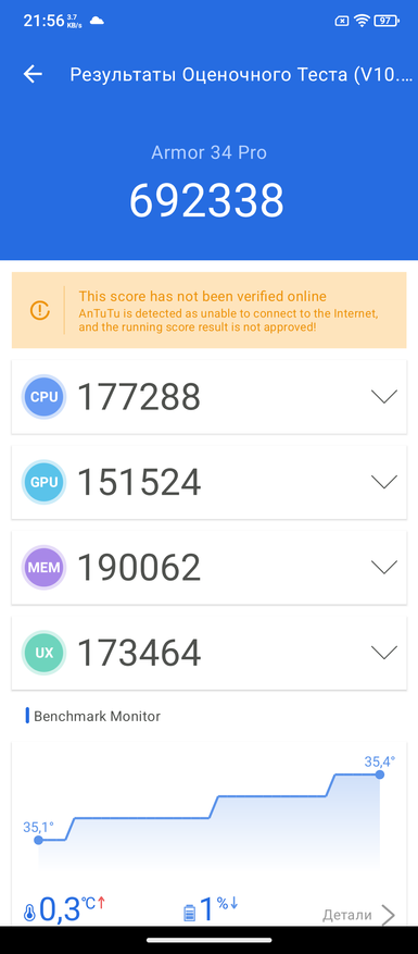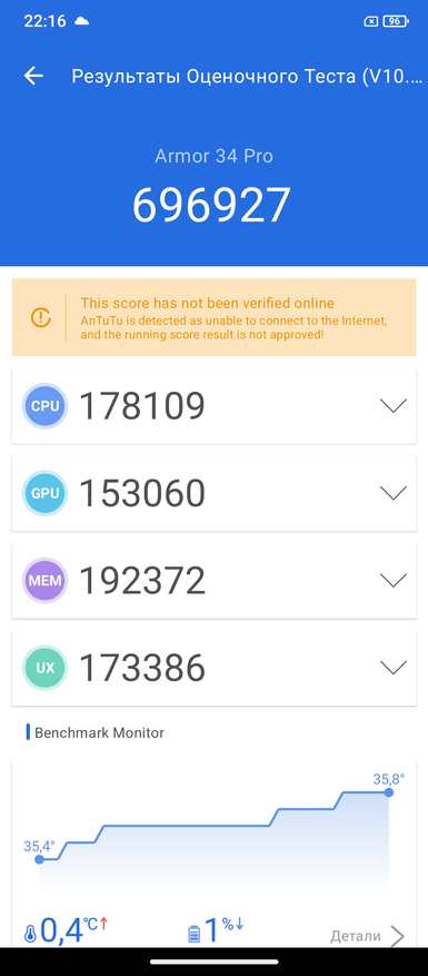 При знакомстве с новым телефоном я сначала обращаю внимание на процессор. Если с ним все в порядке, то дальше дополнительные опции уже имеют вес. В противном случае я про себя думаю, да, хорошо, но процессор не очень. В случае Ulefone Armor 34 Pro — это MediaTek Dimensity 7300. В большинстве текущих моделей защищённых брендов и используется именно такой процессор. Набираемых 700 тыс. баллов в тесте Antutu сейчас хватает, как и в ближайшие пару лет. Далее у обозреваемого есть двухдиапазонный GPS, Wi-Fi 6E, Bluetooth 5.4, память 16/512 ГБ и современная ОС Android 15.