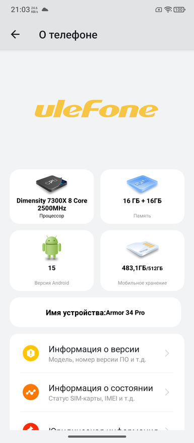 Говорить, что Ulefone Armor 34 Pro получился уникальным, сложно, но относительно других защищённых смартфонов такое утверждение имеет право на жизнь. Сейчас вышли модели с разными дополнительными опциями на таком же процессоре или немного хуже. Относительно используемого в телефоне MediaTek Dimensity 7300 я бы сказал, что это минимум, который сейчас стоит рассматривать. Производительности хватает. В системе есть 16ГБ оперативной памяти и 512ГБ внутренней. Обе можно расширить.