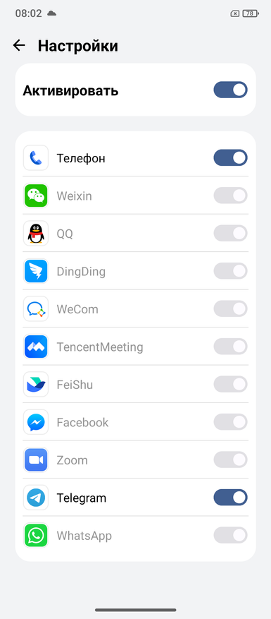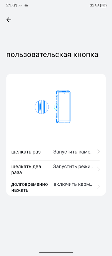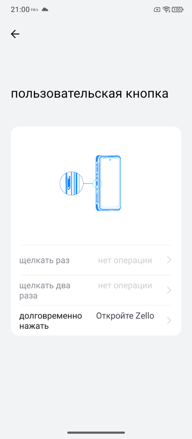 У телефона две боковые кнопки. Правая, что находится внизу, используется для проектора. Вторая, посередине на боковой грани может быть настроена на три действия. Есть ограничение в выборе количества возможных действий. Как показал ниже, если оставить включение Zello, или выбрать пуск звукозаписи, или включение карманного фонаря, то два из трёх действий будут неактивными. Назначить три действия можно. Ниже показал, что