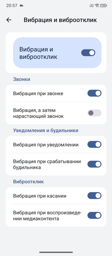 Настройка виброотклика самая простая. У него нет уровней. В телефоне нельзя выбрать ее силу. Она топорная, но поначалу будет казаться интересной. Потом мне надоели однообразные постукивания и я отключил опцию везде.