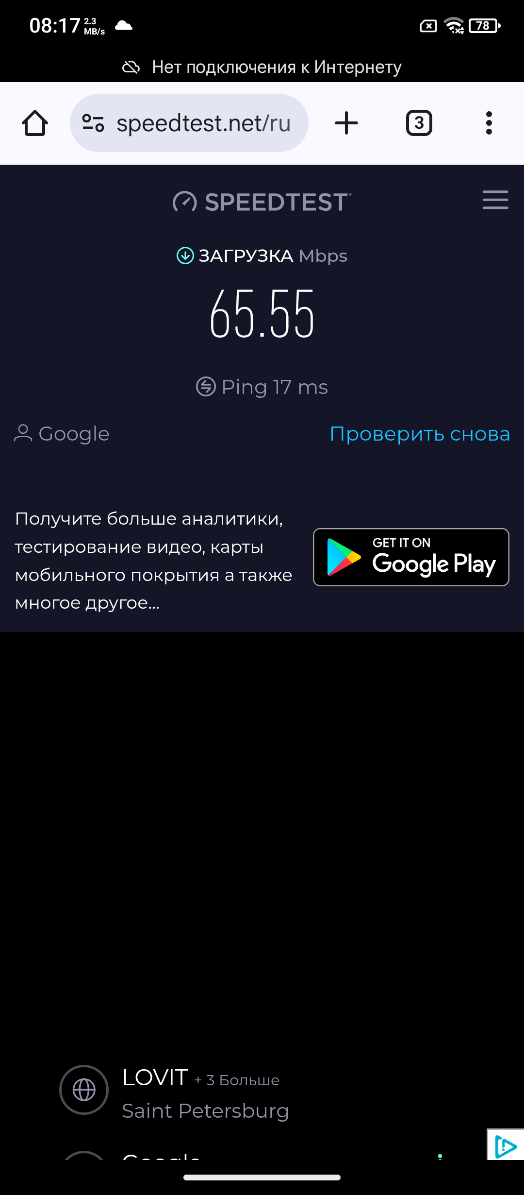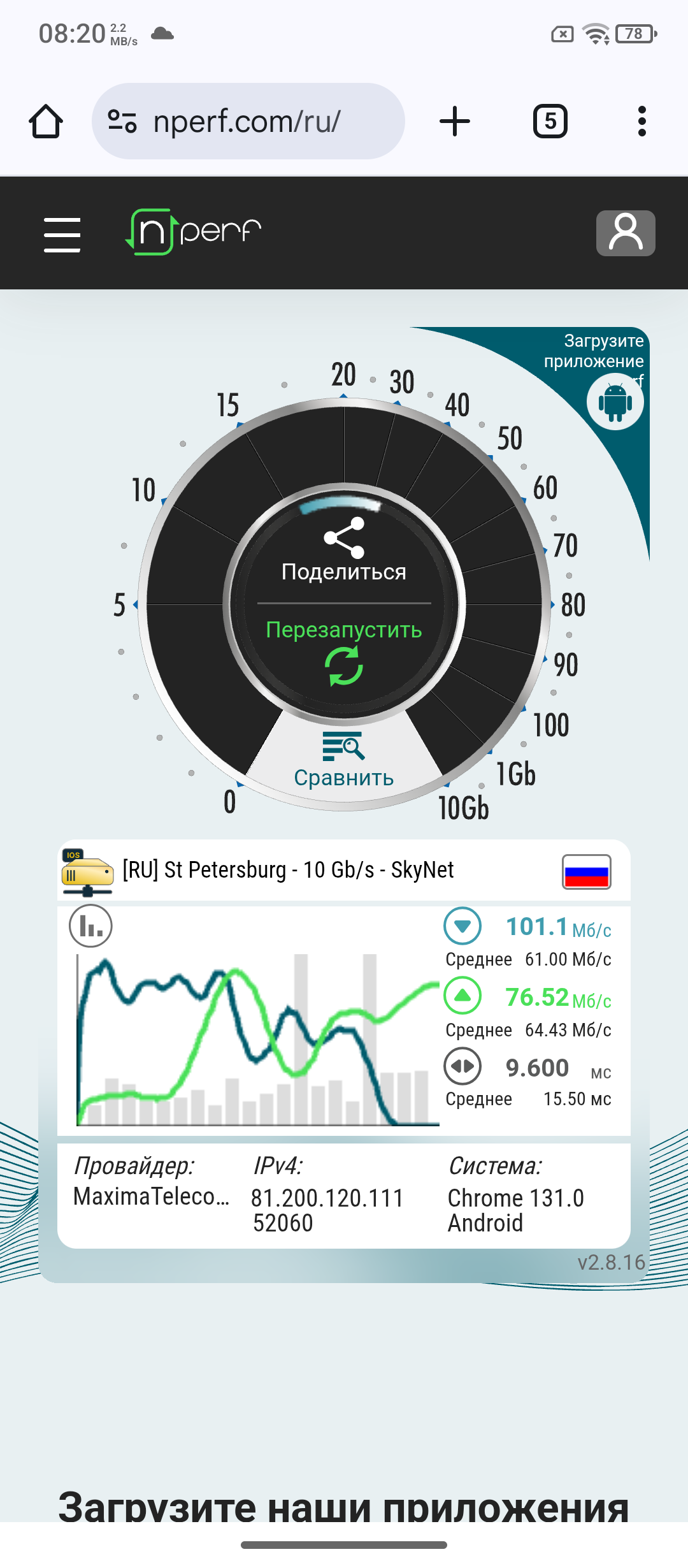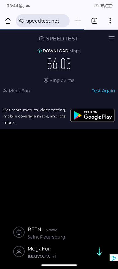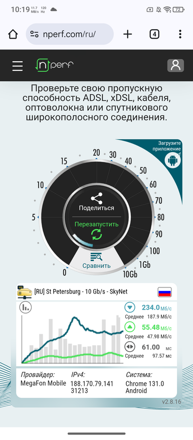 В тестах на скорость интернета удалось получить цифры в 234 и 55 Мб/с на скачивание и загрузку. Такие результаты получен возле вышек. В телефоне установлен модель Wi-Fi 6E. Наряду с Bluetooth 5.4 у товара современные протоколы связи, как и двухдиапазонный GPS.