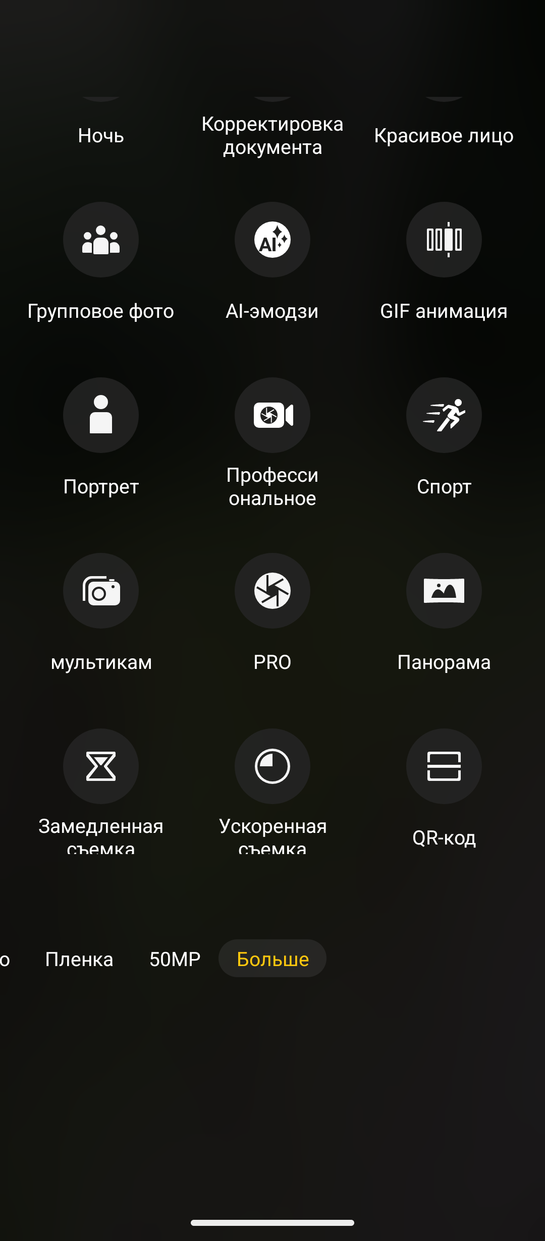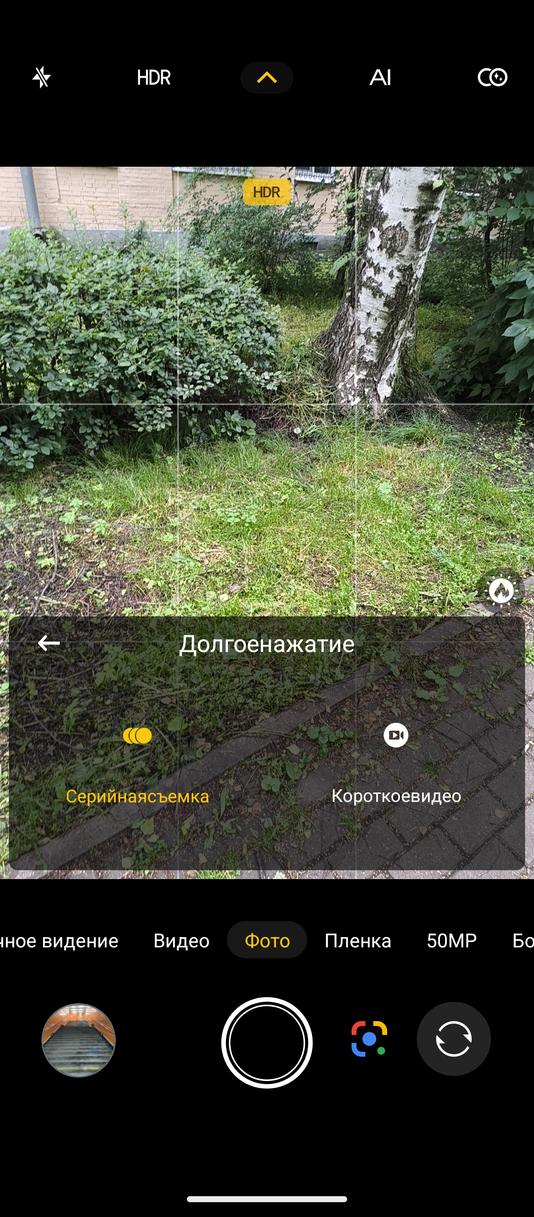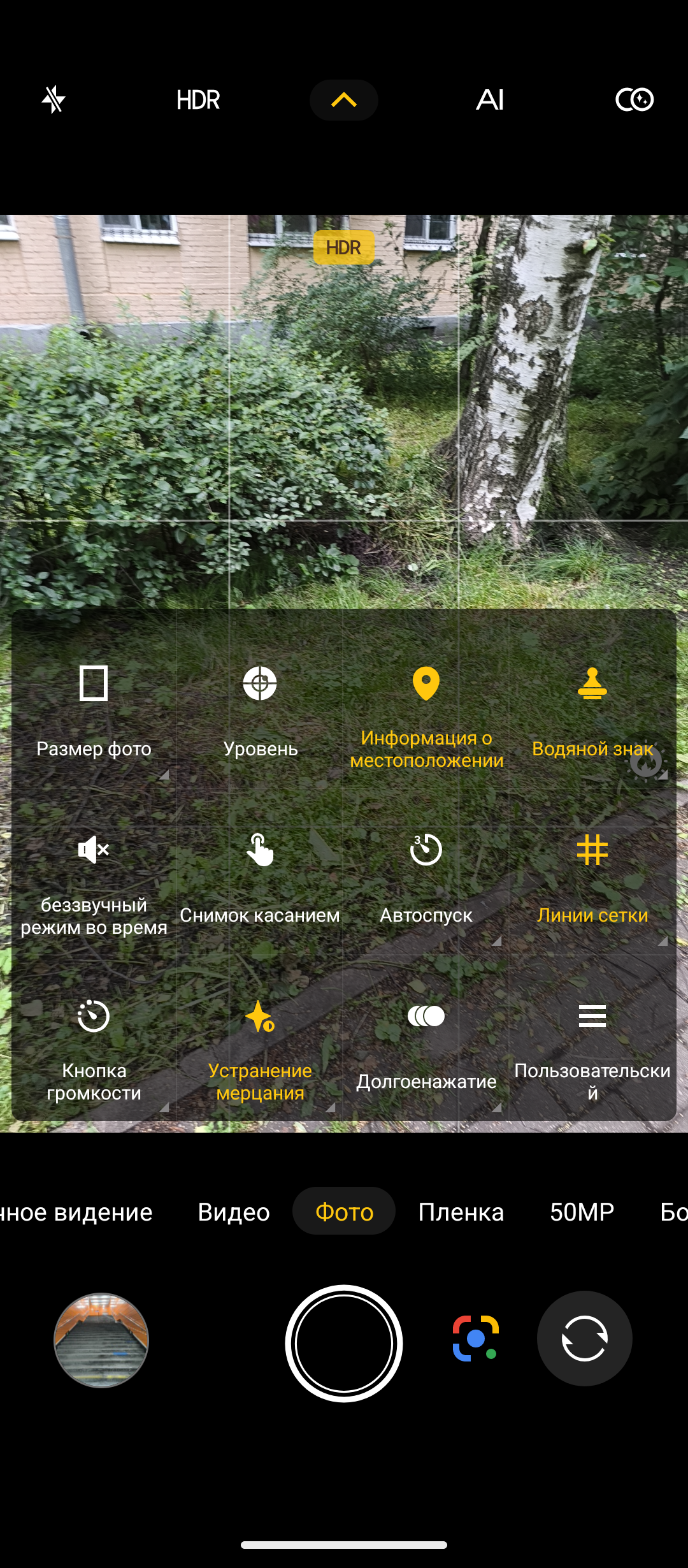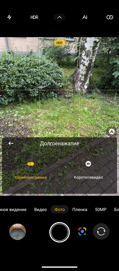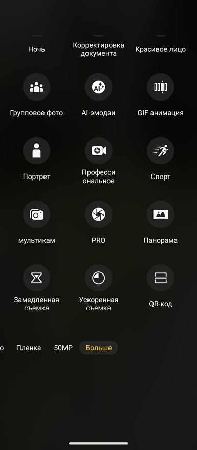 Настройки камер показал на скриншотах ниже. Видео можно писать в разрешении 4К при 30 к/с только с основной 50МР камеры OmniVisiom OV50H. Если начинать запись с 50MP широкоугольной Samsung JN1 или 32MP фронтальной Samsung GD2, то разрешение ограничено 1080р. Электронная стабилизация работает только при разрешении 1080р с основной камеры. Можно назначить действие по долгому нажатию кнопки: или серийная съёмка, или запись видео. Дополнительно есть режимы фотографирования, как Пленка, Pro, gif-анимация, Портрет, AI-эмодзи и другие. Настроек у камер много и они не отличаются от тех, что есть в моделях других брендов.