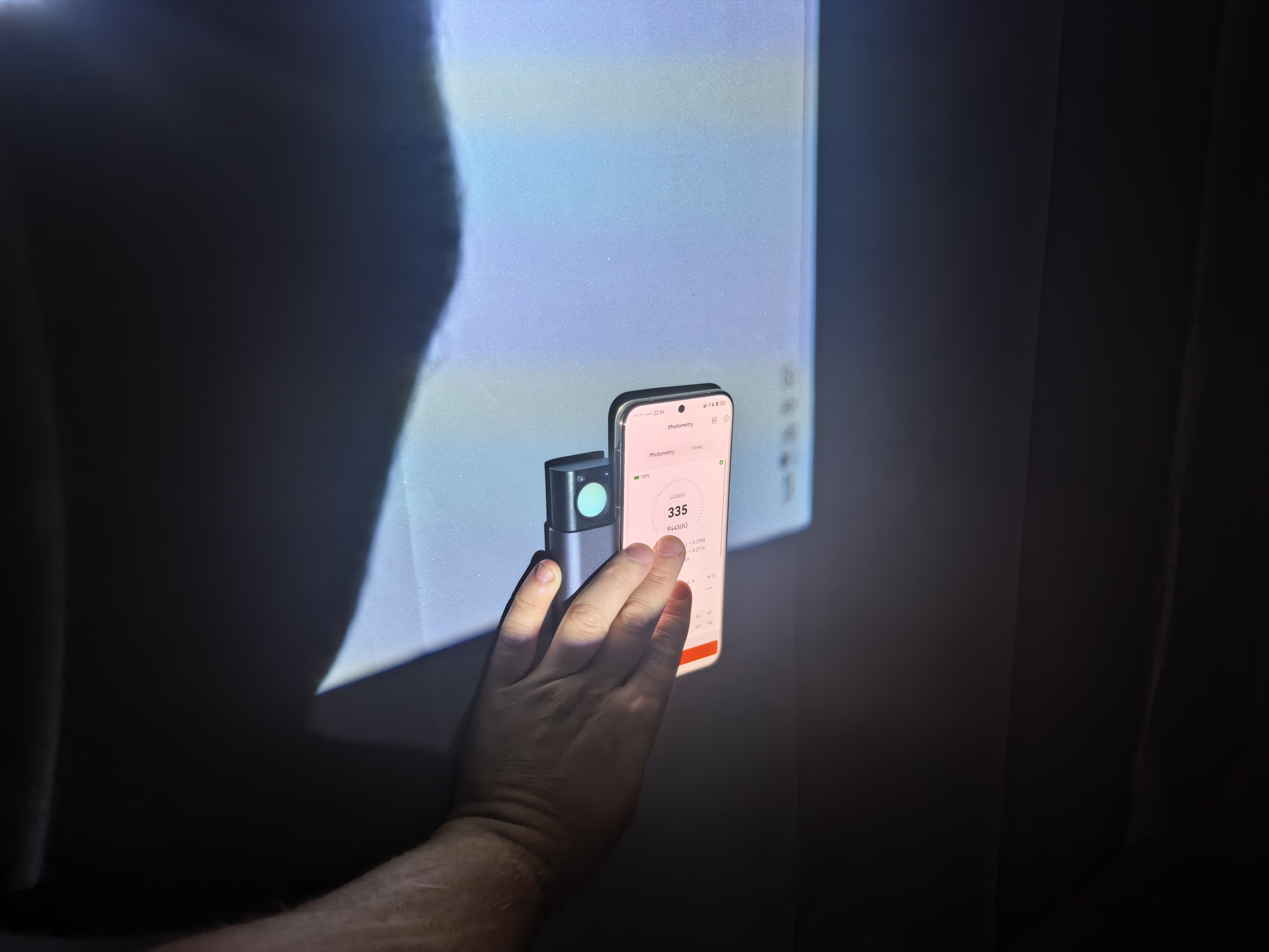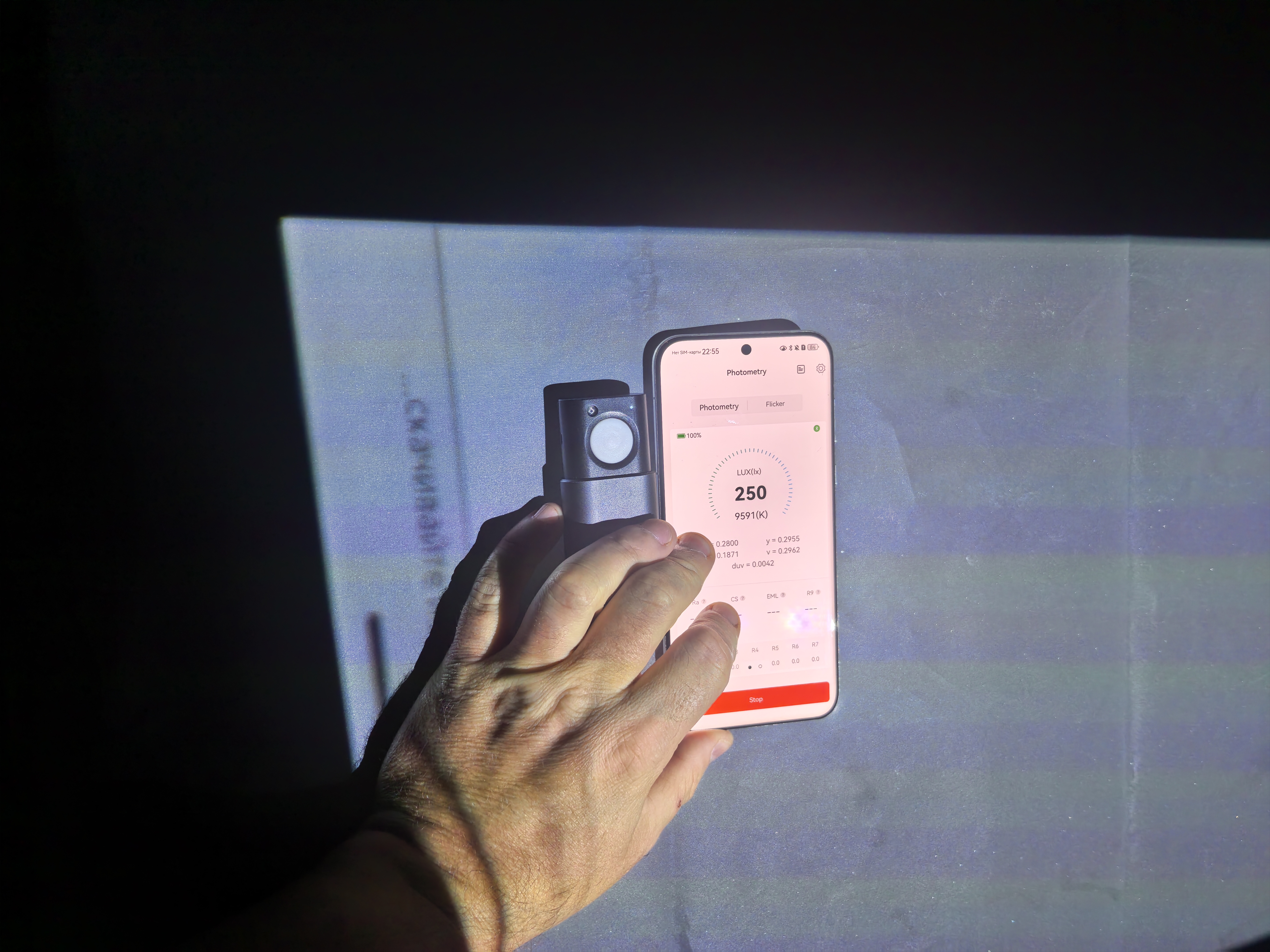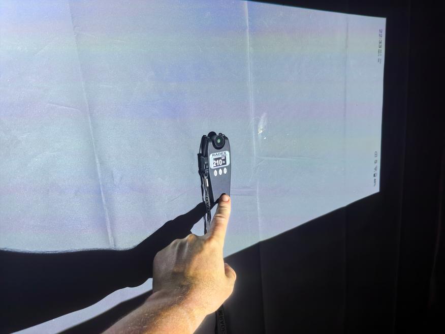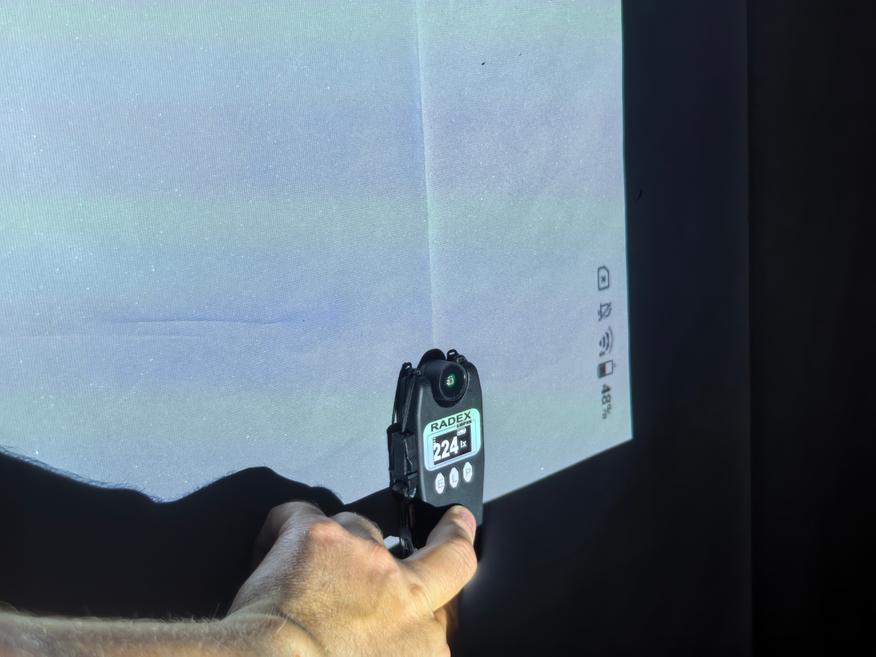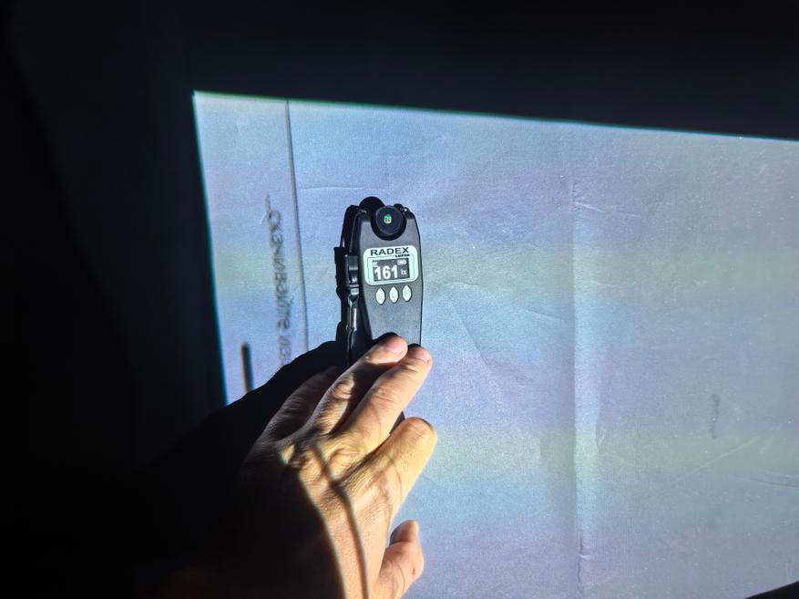 Теперь можно оценить яркость проектора, выраженную в Люменах. Делать это буду по усредненному значению девяти точек освещенности с помощью Radex Lupin, выраженных в Люксах, учитывая площадь проекции.