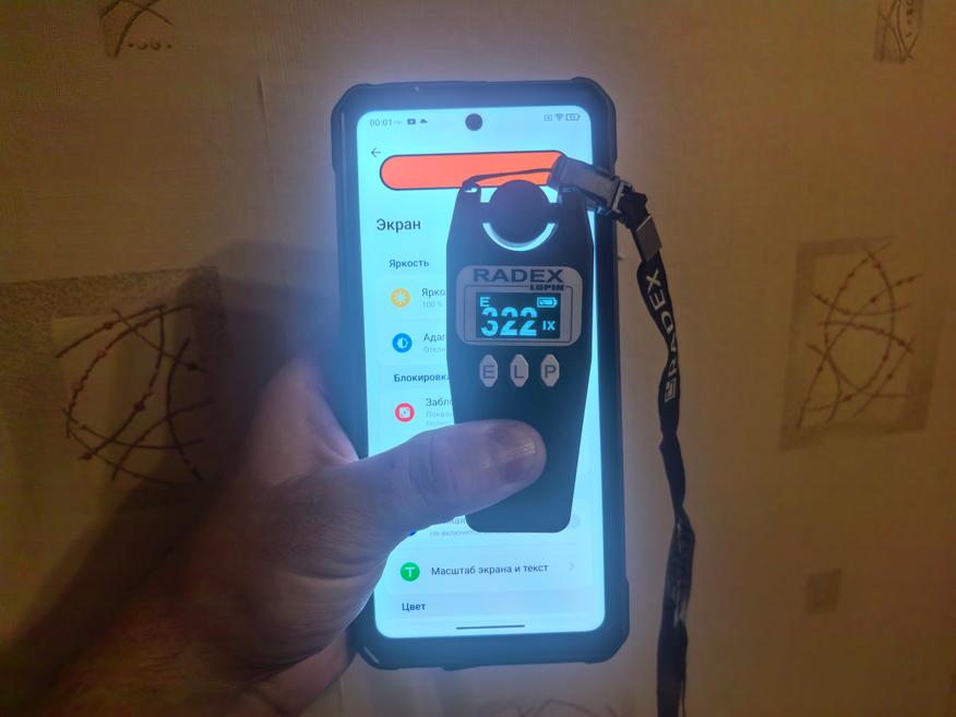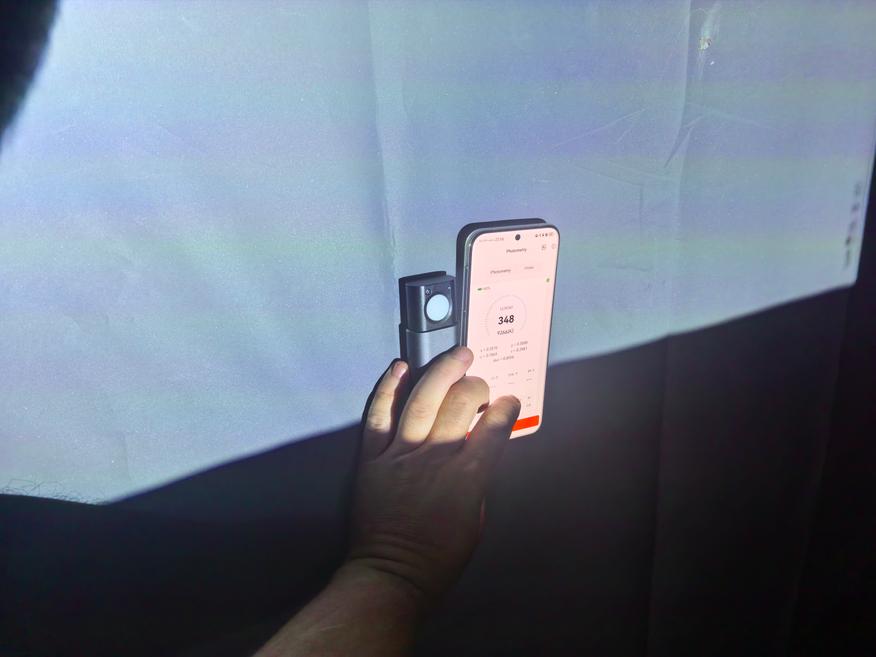 В обзорах проекторов бренда 8849 я пользовался другим прибором, Opple Light Meter 4. В предыдущих обзорах у меня получались паспортные значения яркости в 100 ANSI Лм. Повторение оценок через второй прибор дало крайние цифры освещенности от 250 Лк в верхнем левом углу до 348 Лк внизу по центру. Площадь осталась той же. Получается, что, по Opple Light Meter 4, яркость проектора в Ulefone Armor 34 Pro равна 105 ANSI Лм. Иными словами, заявленной цифры не получилось, но в случае производителя могла быть другая более качественная отражающая поверхность. Я не защищаю Ulefone, но яркость проектора мне нравится как минимум не меньше, чем у 8849 Tank 2 Pro (обзор здесь).