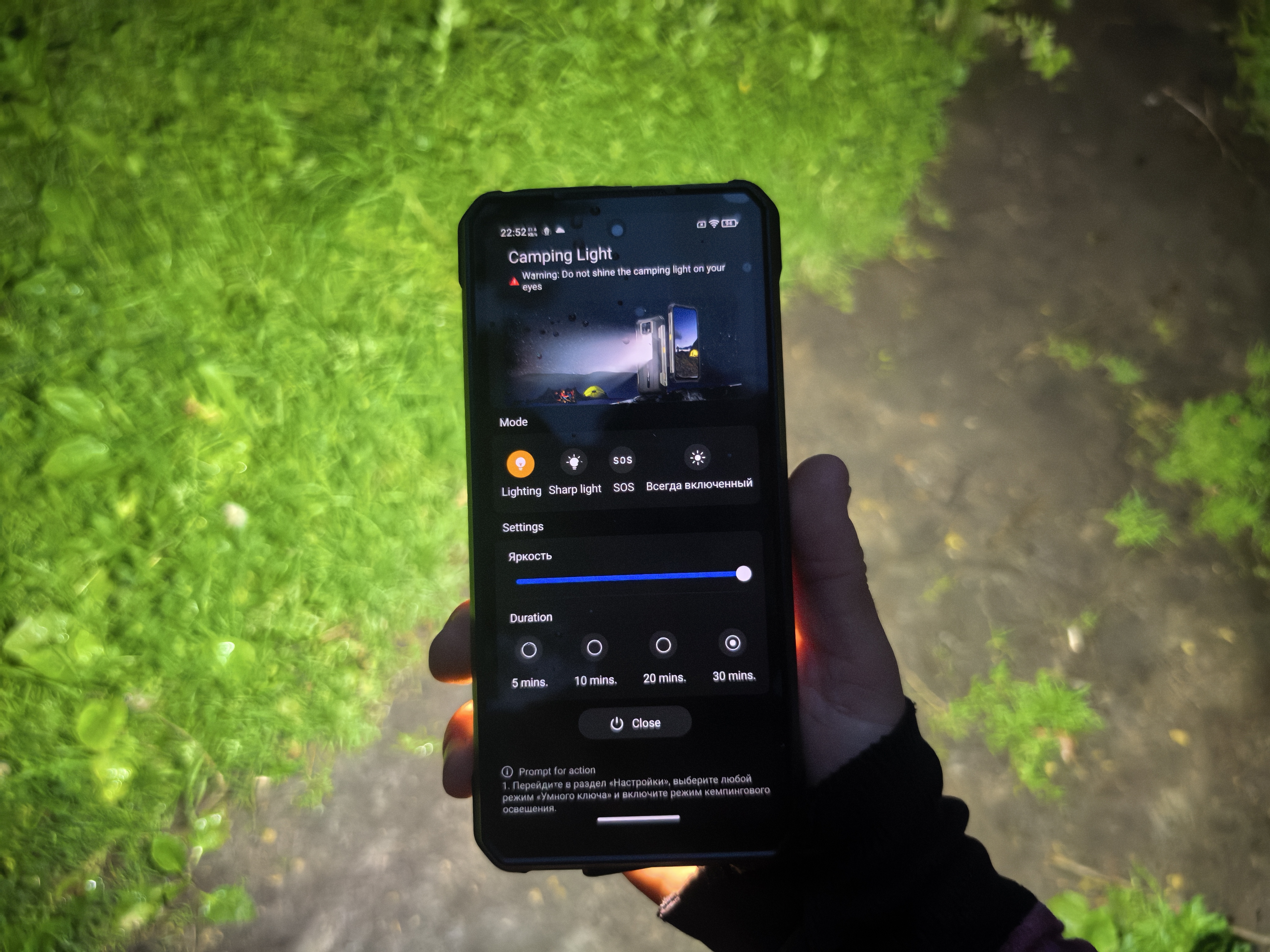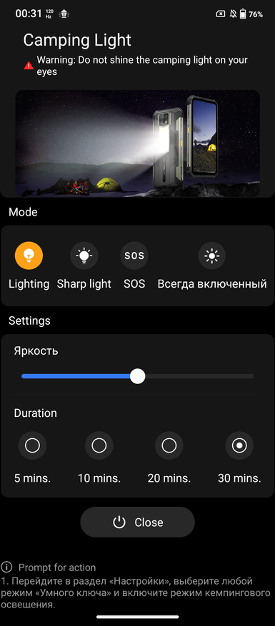 Фонарь может работать в четырех режимах: светить ярко (Lighting), мигать (Sharp Light), SOS и Всегда включенный. Первый режим самый яркий. В нем можно настроить интенсивность. По умолчанию он включается на 50%. В четвертом режиме яркость ниже. Можно выбирать продолжительность свечения в первом и втором режимах.