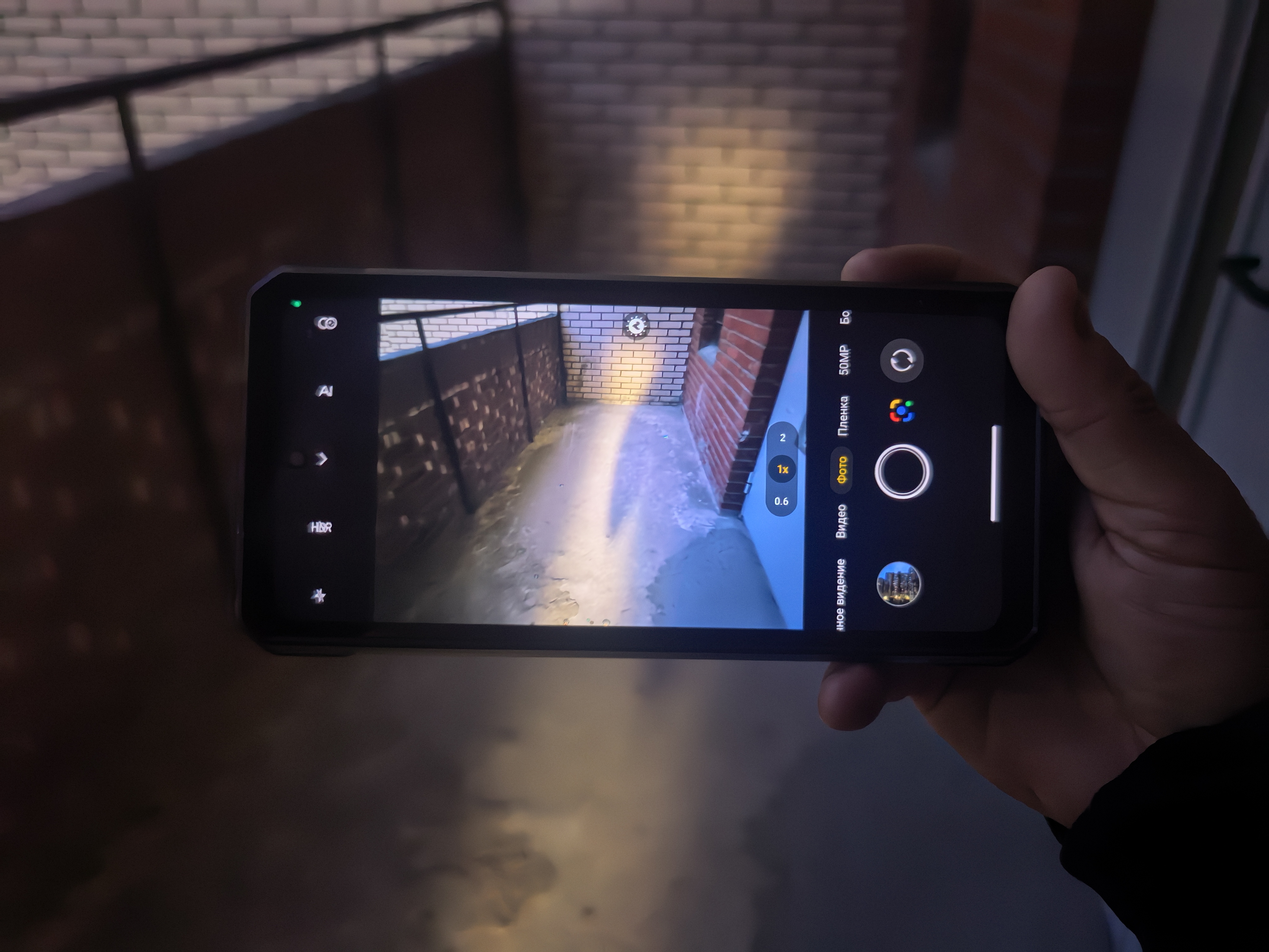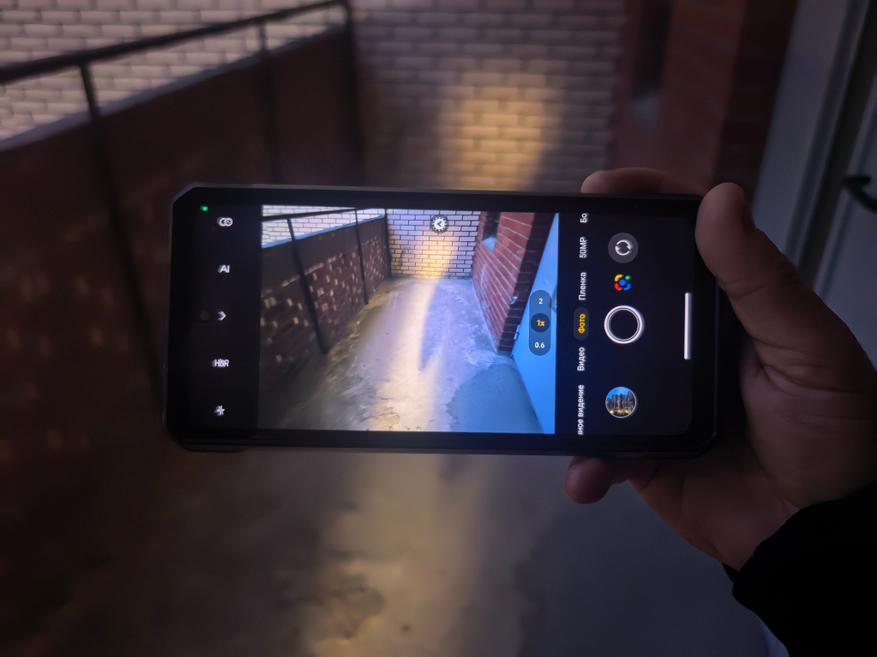 Фонарь можно использовать во время фотографирования или записи видео. Он яркий и расположен разумно относительно камер. Он не засвечивает одну сторону кадра, а делает всю его площадь яркой. На втором снимке ниже это как раз и видно. С фонарем Ulefone Armor 34 Pro можно вести запись видео в темноте. Получается, для съёмки близко расположенных объектов ночью можно включать фонарь, а всё, что дальше, «видеть» через инфракрасную камеру с четырьмя диодами. Хорошо, что диодов четыре, так как чем их больше, тем лучше видно через такую камеру. В других достойных смартфонах их всегда по 4 штуки. Не хочу сказать, что 2 диода совсем плохо, но 4 лучше.