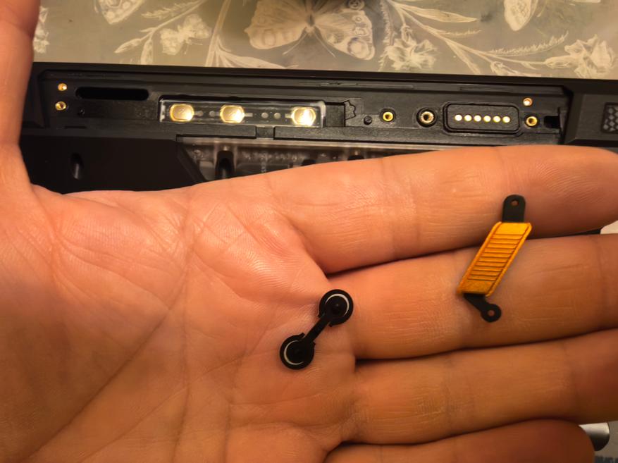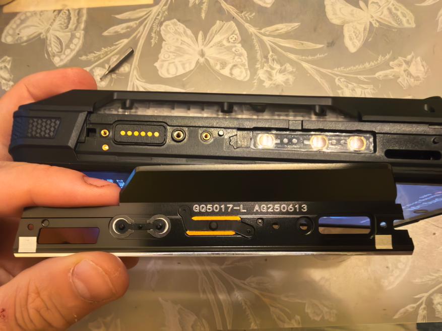 Корпус имеет огромную толщину в 33 мм (Карл, это 3,3 см!). Кнопки громкости и одна из двух клавиш быстрого вызова с сим-лотком, а также магнитный коннектор расположены с одной стороны, с противоположной -кнопка включения и вторая клавиша быстрого вызова. Вторая из коробки назначена на включение проектора по удержанию (можно поменять). Лампа проектора расположена на верхней боковой части корпуса. Под заглушкой на нижней грани спрятаны USB-C 2.0 OTG порт и 3,5 мм разъем для наушников.