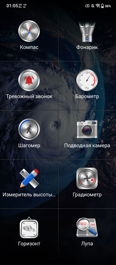 Как и в любом защищённом устройстве, в обозреваемом есть программа-папка в «Инструментами». К ним относится барометр, шагомер, тревожная кнопка, высотомер, лупа, отвес, чат без сети и другие. Отдельно есть программа-тамагочи: в телефоне будет жить виртуальный питомец, за которым надо ухаживать. Такая опция, как по мне, выглядит странно.
