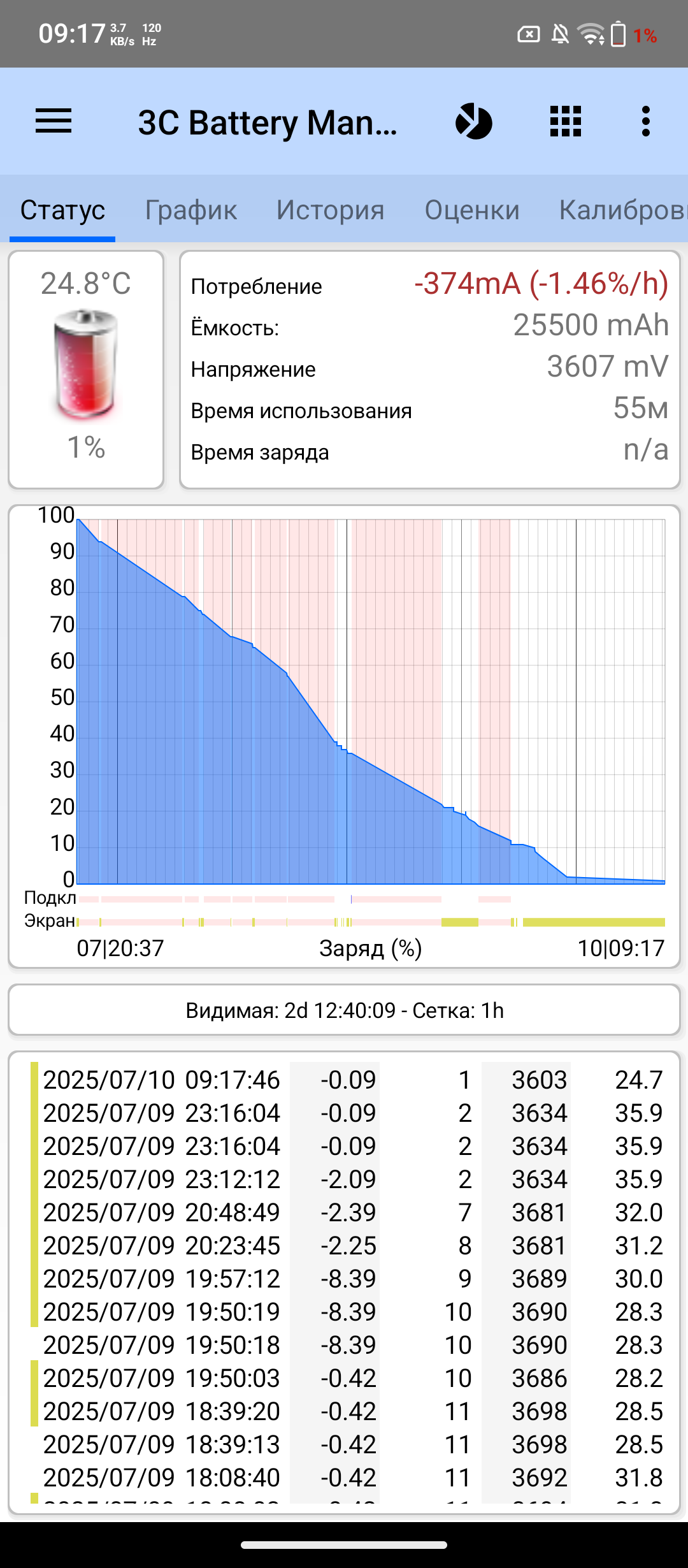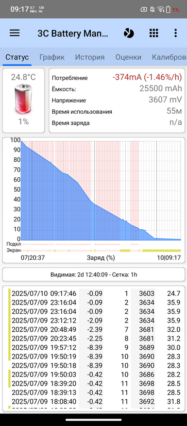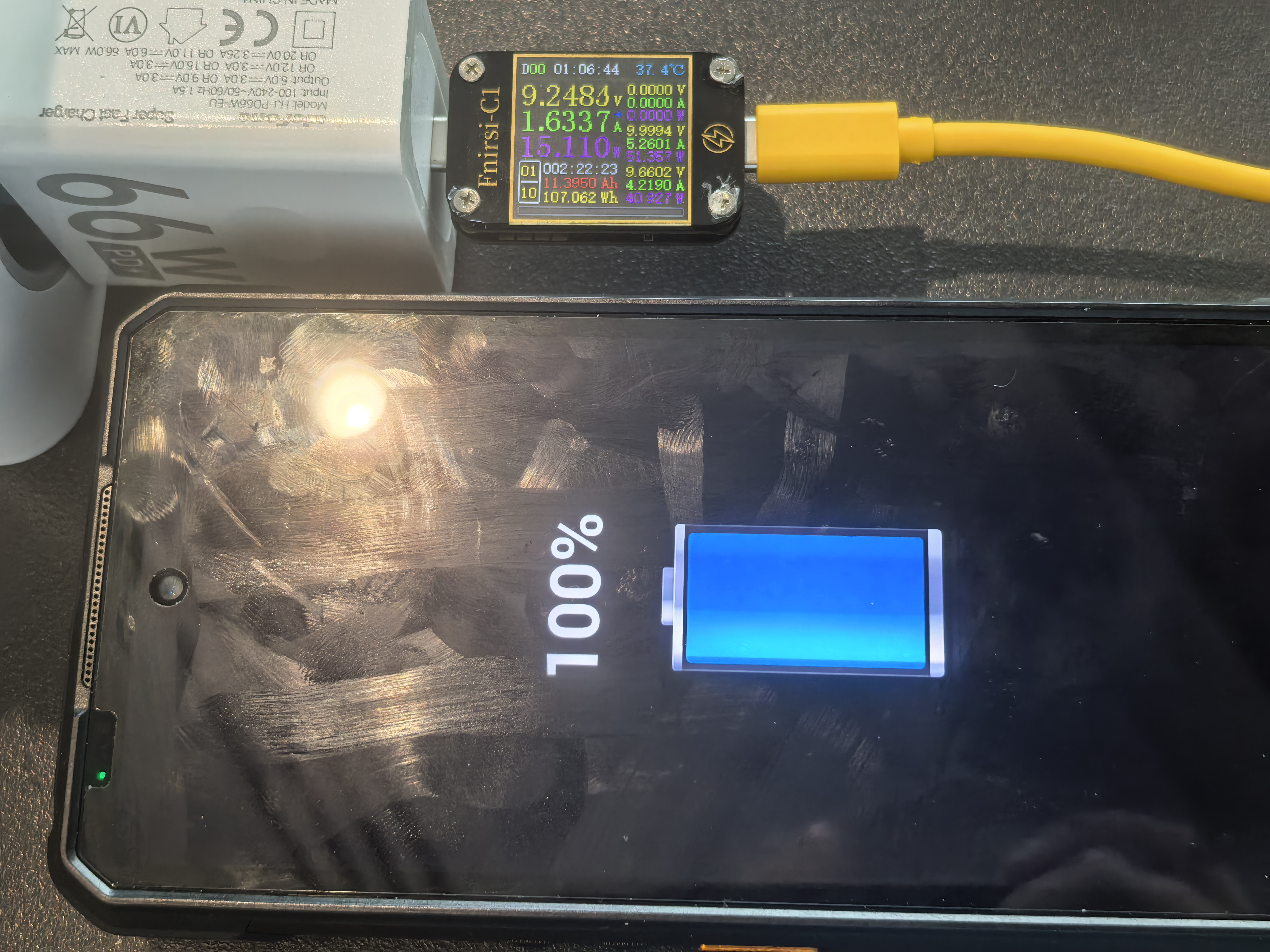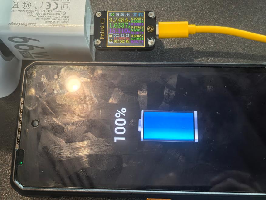 Заряжается защищенный смартфон за 140 мин на 11395mAh (107,1Wh). Из выключенного состояния процесс идет на 5V/2A в течение 5 мин, потом он включается и начинает работать быстрый режим 9V/6A. За весь процесс и ЗУ, и телефон нагреваются. Ниже показал таблицу заряда за 100 мин. Получается, что за 100 мин можно зарядить 25,5Ah аккумулятор практически на 80%.