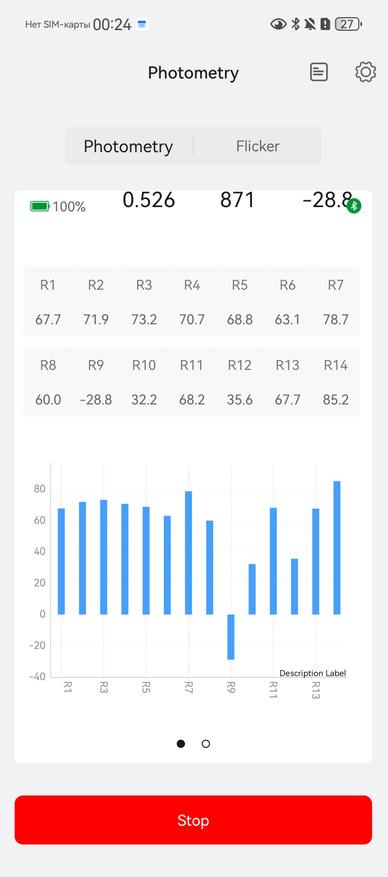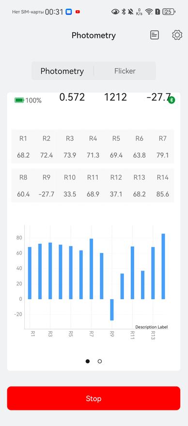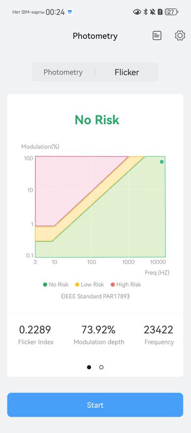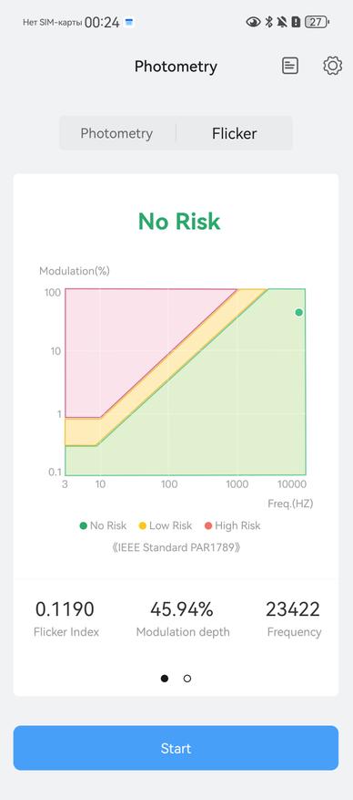 Повторил оценки с помощью прибора Radex Lupin. Кроме яркости оценил пульсации. Замеры производились в том же положении до прибора, что и выше. Цифры получили от 0,83 до 1,16 %. Свет от фонаря безопасен для глаз, но только при освещении объектов, а не свечении им в глаза. При открытии приложении фонарь появляется предупреждение, что в глаза светить нельзя!