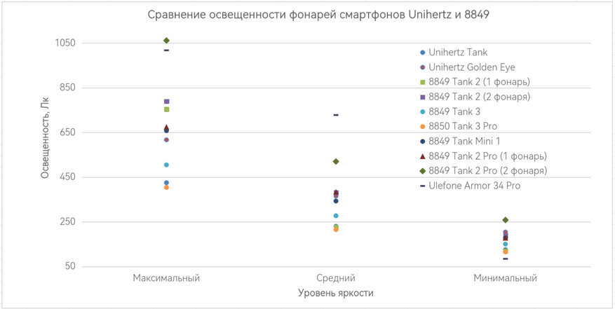 Результаты оценивания освещения фонаря обозреваемого с другими телефонами с подобной опцией показал на точечном графике. По графику видно, что обозреваемый при 100% освещенности фонаря практически догнал 8849 Tank 2 Pro. В среднем режиме,