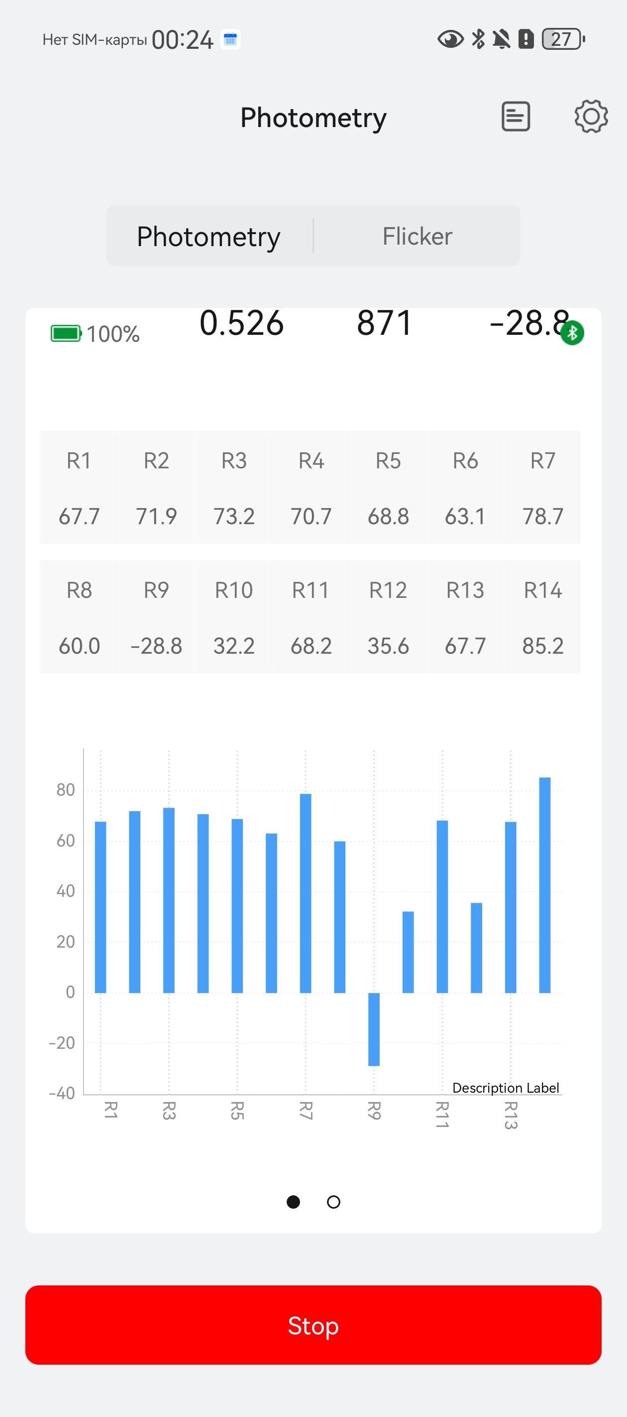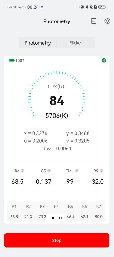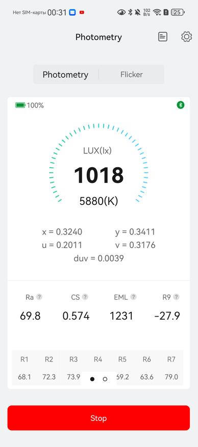 Lighting 100%. Яркость — 118 Лк, цветовая температура — 5880К. Пульсаций нет. Модуляция в «зелёной зоне». Показатель duv меньше 0,004, поэтому цвета освещаемых объектов не будут отличаться от реальных. Ra — 69,8.