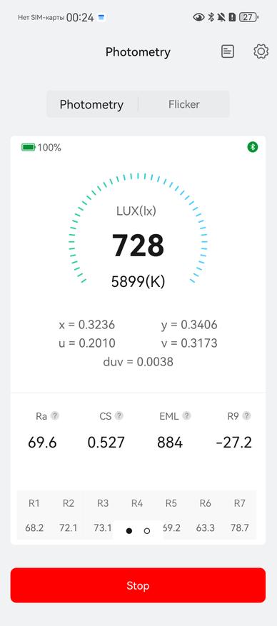 Lighting 50%. Яркость — 728 Лк, цветовая температура — 5899К. Пульсаций нет. Модуляция в «зелёной зоне». Показатель duv меньше 0,004, поэтому цвета освещаемых объектов не будут отличаться от реальных. Ra — 69,6.
