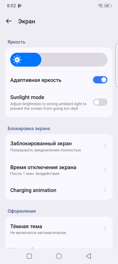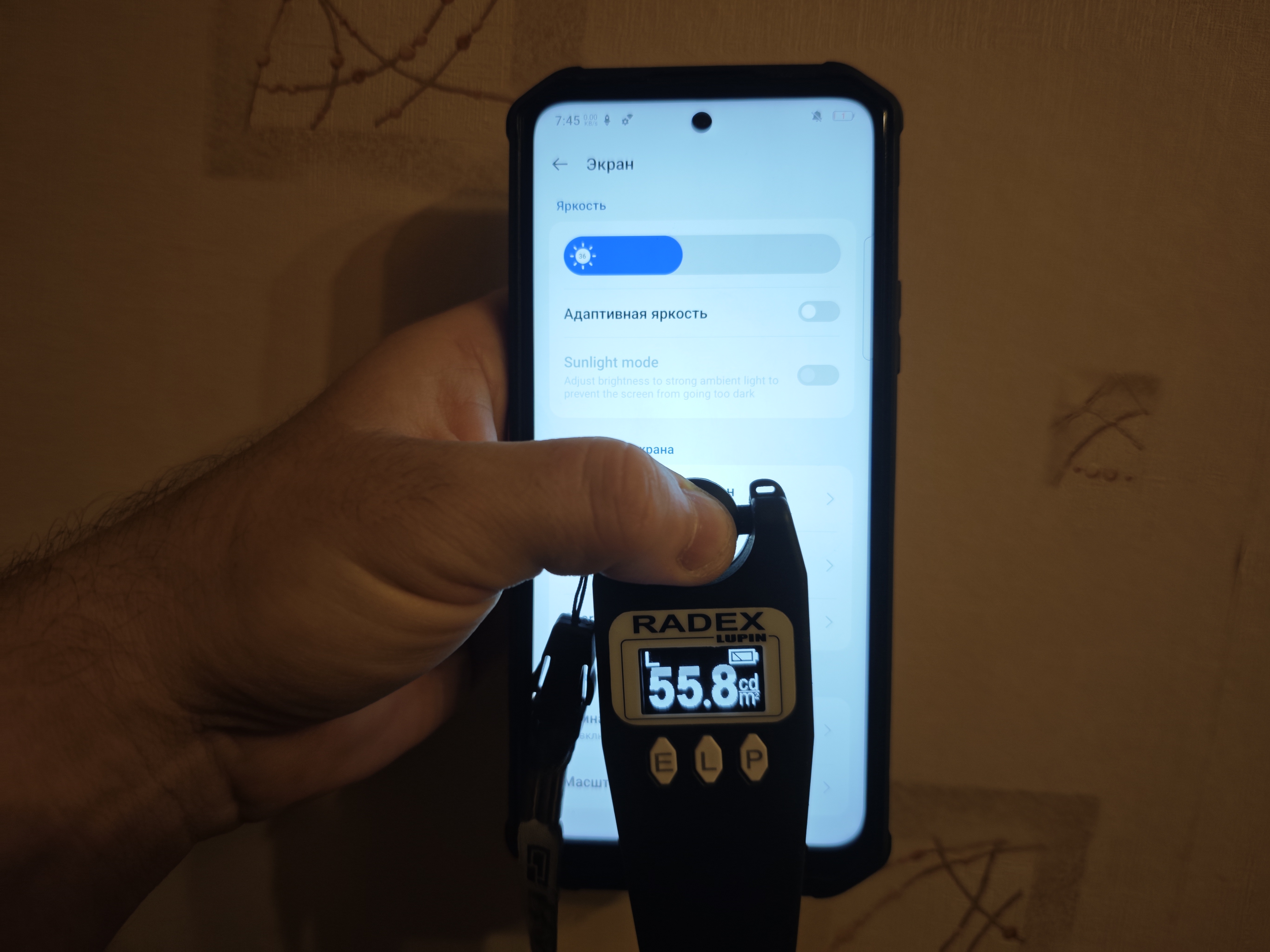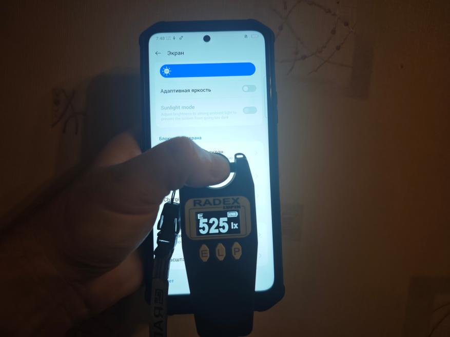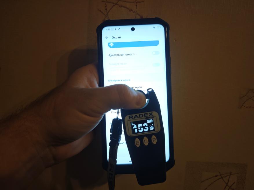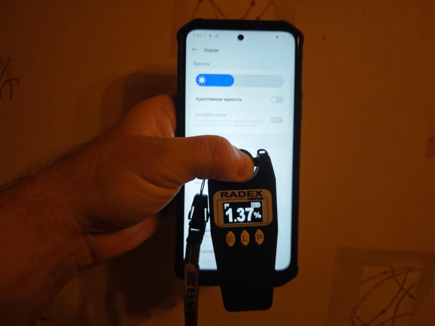 По характеристикам видно, что яркость заявлена в 400 нит. У меня получилось при помощи Radex Lupin, что она равняется 525 Лк, 152 кд/м². Уровень небольшой, если использовать на открытом солнце, так как считывать информацию с экрана будет неудобно. Для взаимодействия с экраном в помещении его достаточно. Учитывая это, понизил яркость теста на разряд с помощью просмотра YouTube до 36% (56 кд/м²). Пульсаций подсветки нет, так как это IPS-экран.