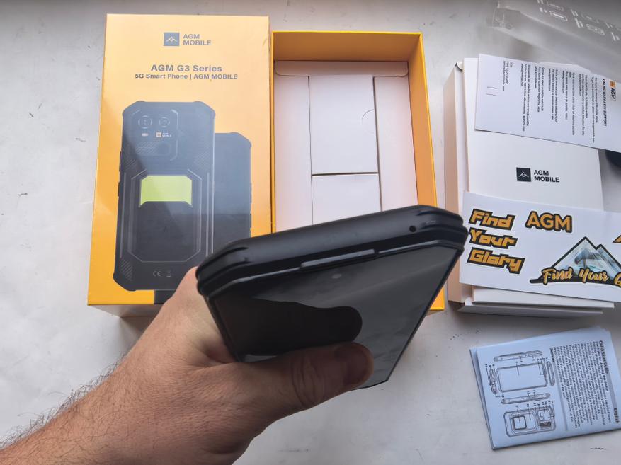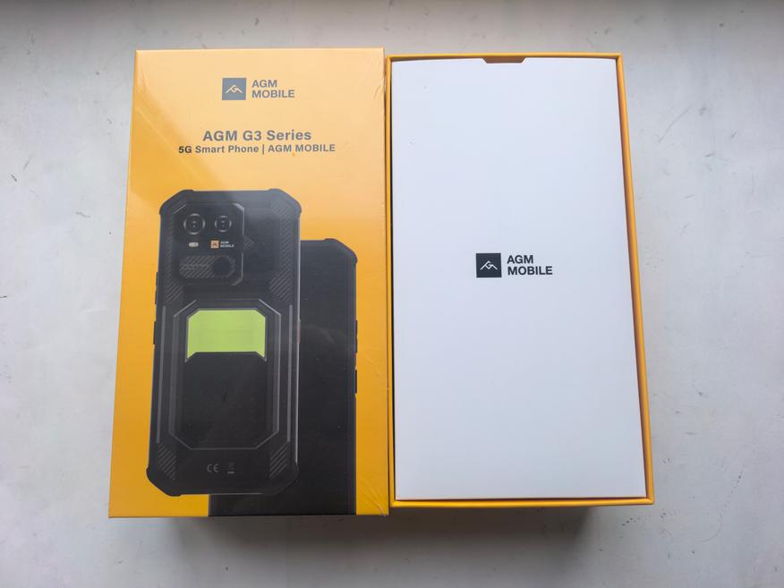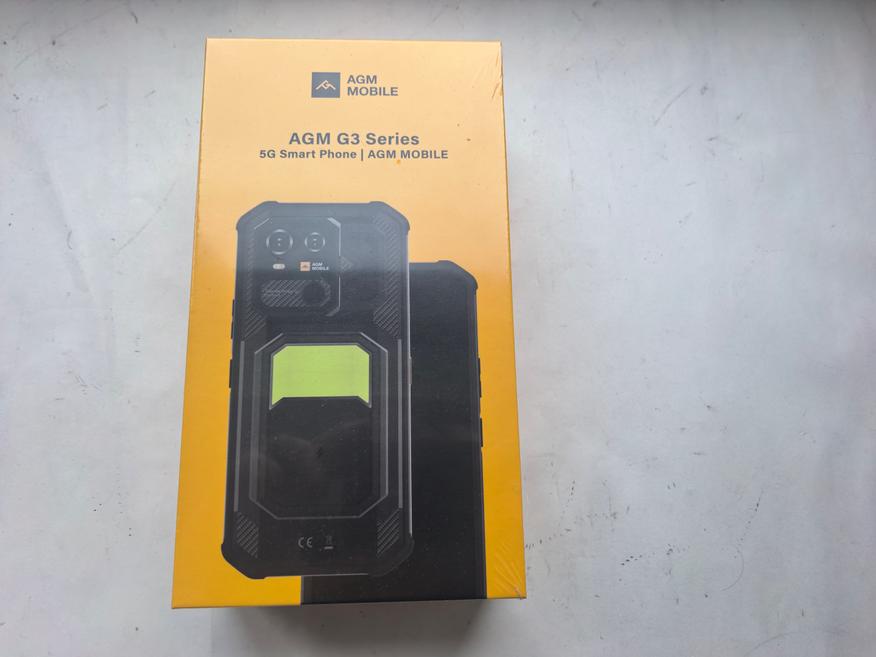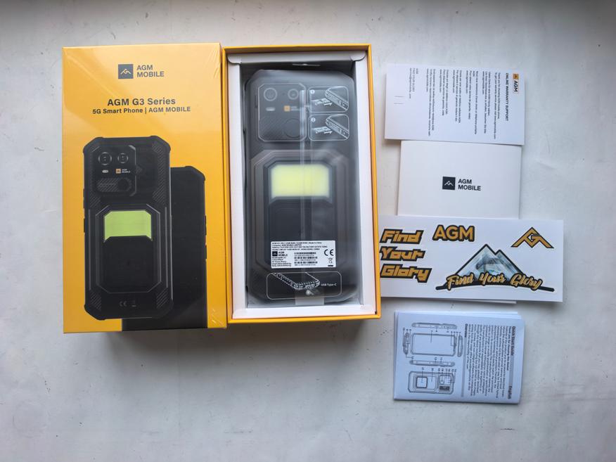 Для AGM коробка желтого цвета стала привычной. На лицевой стороне телефон G3 виден практически полностью. Сразу бросается в глаза фонарь. Кажется, что нижнюю часть можно отодвинуть. Внешний вид необычный.