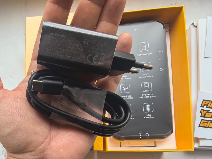Состав коробки ничем не отличается от множества моделей на рынке. Кроме телефона есть зарядный кабель и ЗУ на 33Вт без режима 20В. Заряд идет на 9В,