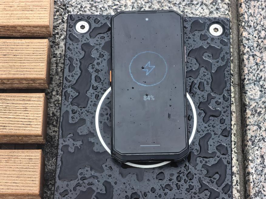 AGM G3 не просто защищенный смартфон с громким динамиком, но еще и беспроводным зарядом. В предыдущих моделях бренда часто были pogopin-коннекторы для восполнения энергии через кредлы. В обозреваемом есть полноценный беспроводной протокол. На фотографии ниже видно, что заряд идет в любую погоду от БЗУ на улицах города.