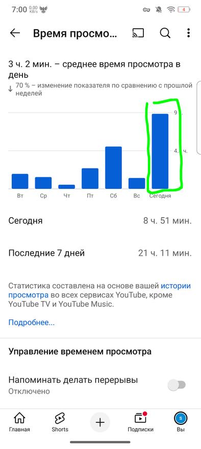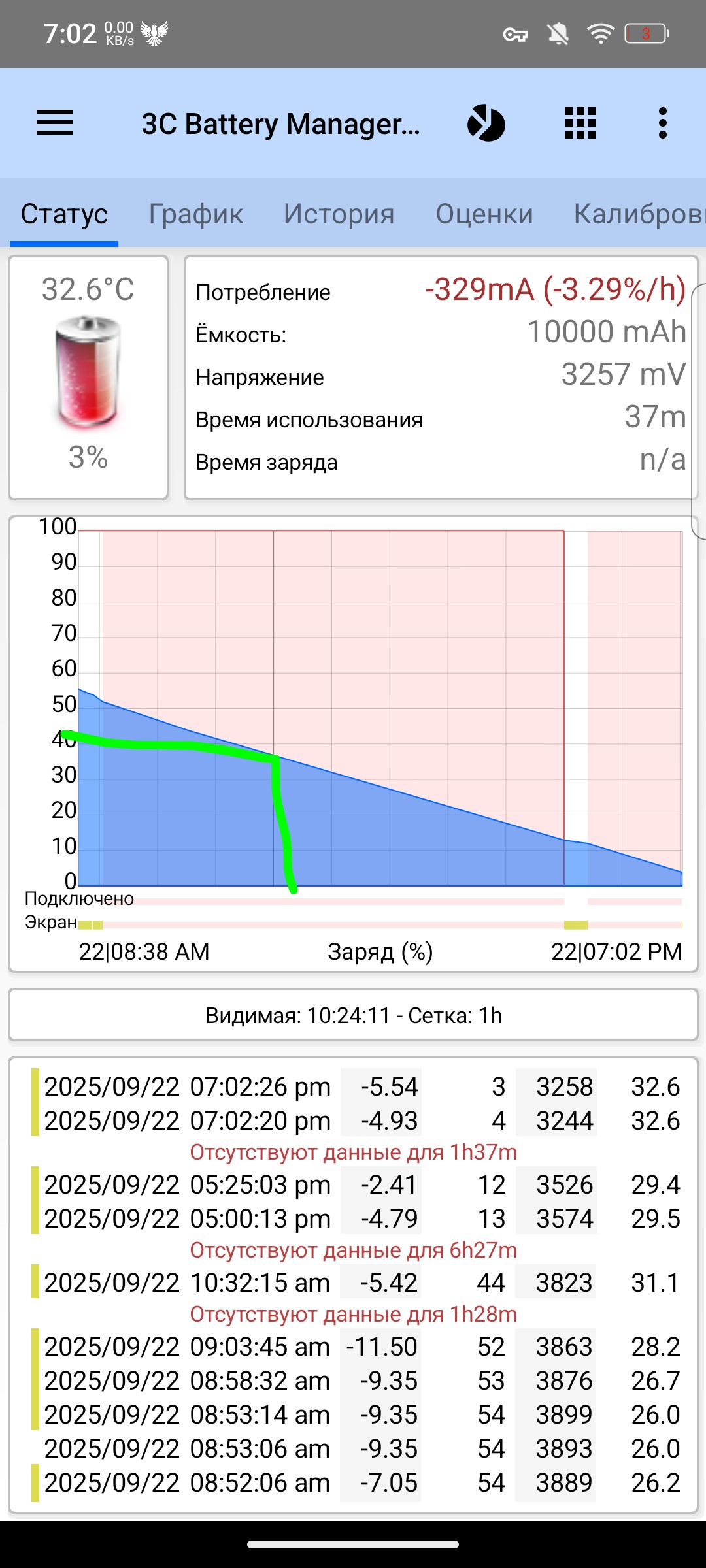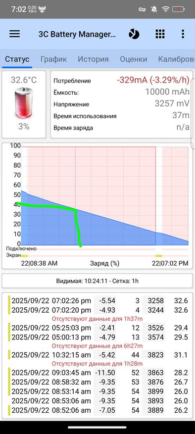 Референсный разряд через YouTube занял практически 9 ч и 40% емкости аккумулятора. Для полного заряда цифра составит 22,5 ч просмотра сервиса. Относительно аналогов это хороший показатель. На скриншотах выделил время использования сервиса за тест (см. первый скриншот). Показал на графике разряда время начала теста (см. второй скриншот).