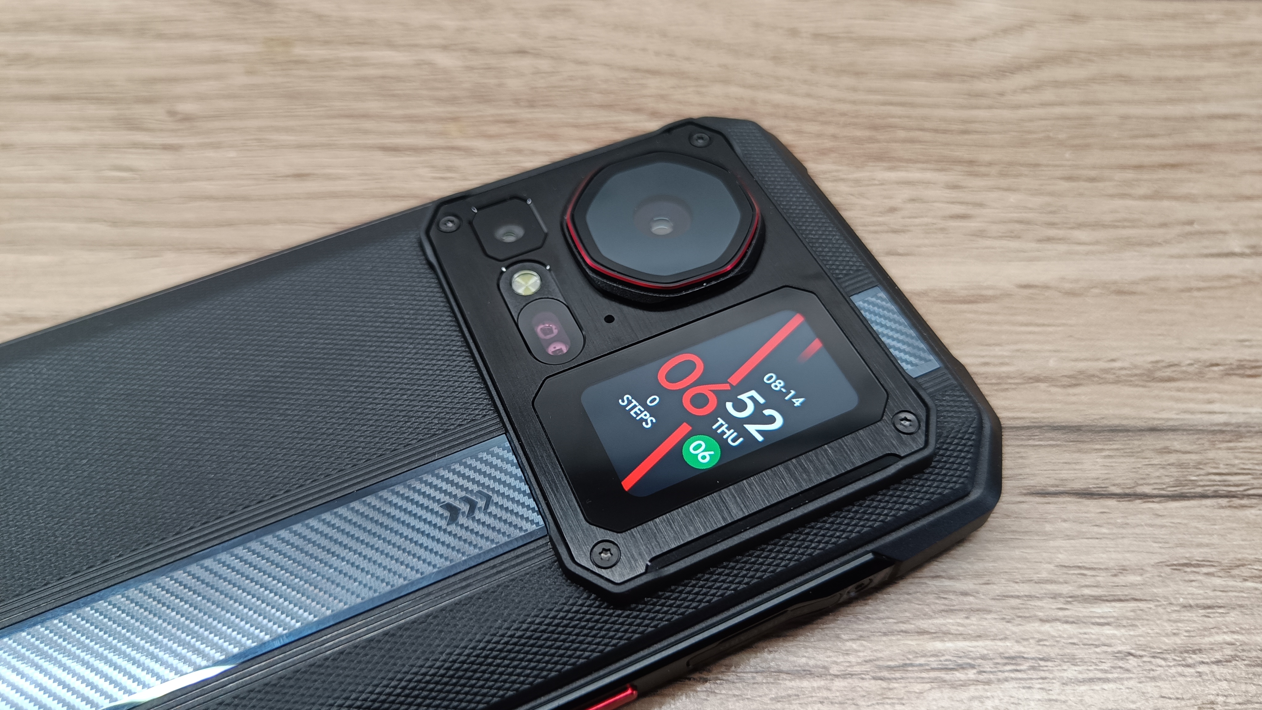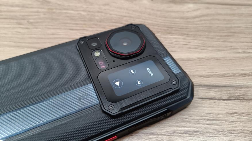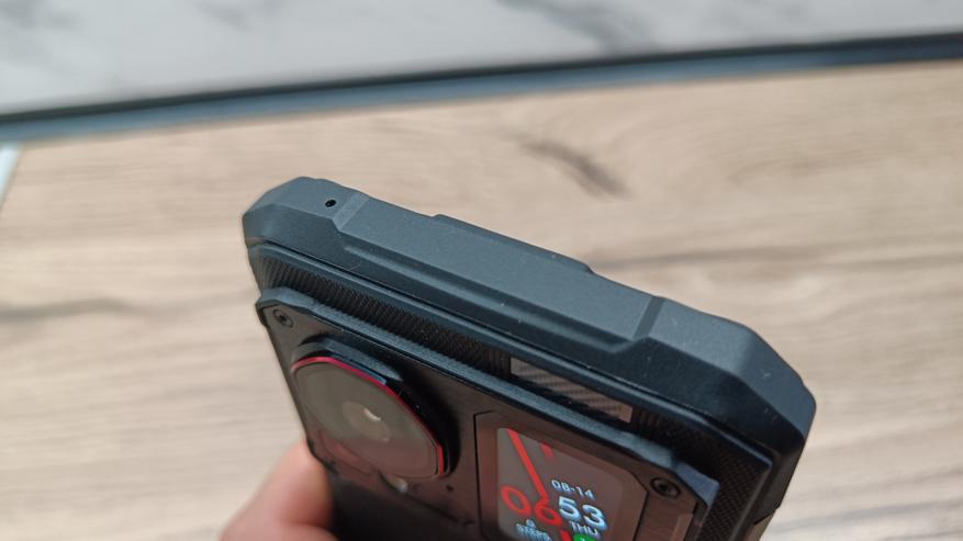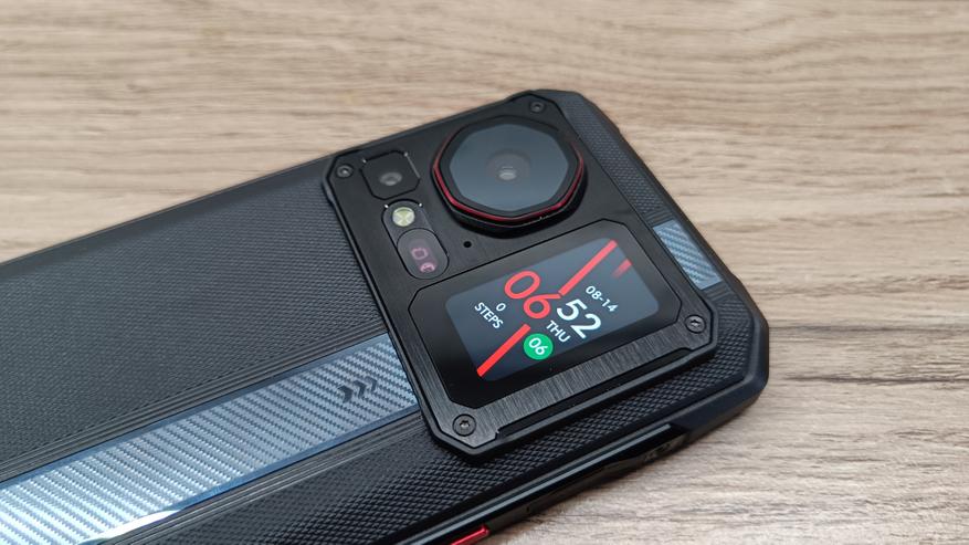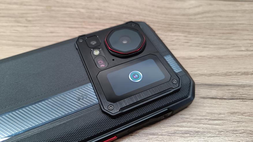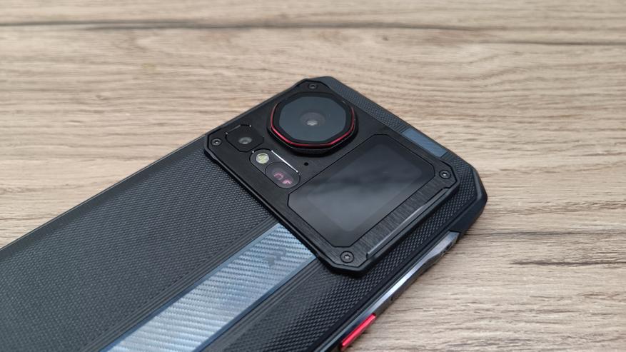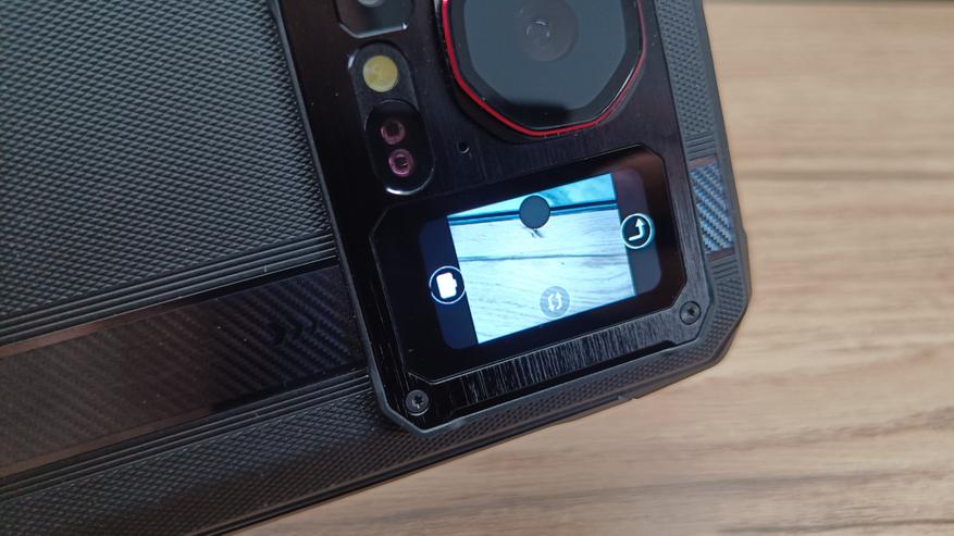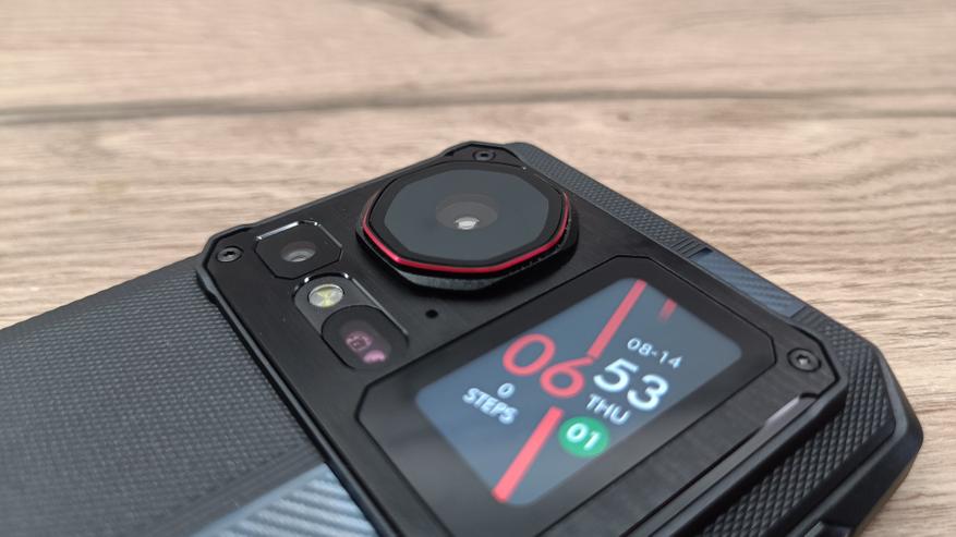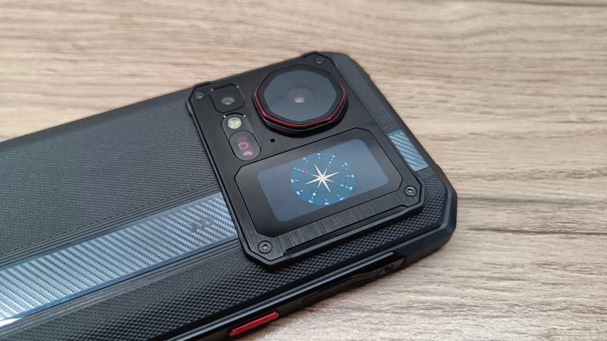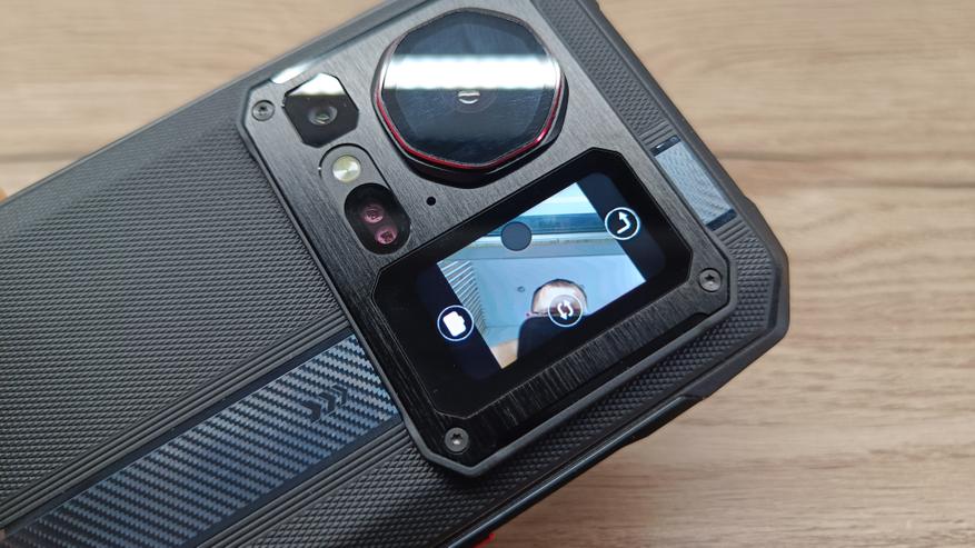 На тыльной стороне есть 2 камеры. Одна из них на 108 Мп на матрице Samsung ISOCELL HM2 со светодиодной подсветкой. Дополнительная камера на матрице Sony IMX550 с ИК подсветкой для фото или видео в полной темноте. Дальность работы ИК подсветки зависит от погодных условий, но детализированные фото получаются на расстоянии в 5-10 метров. Можно разглядеть объекты и на значительном отдалении. Блок камер имеет прорезиненную защиту. Рядом с камерами разместился информационный дисплей диагональю 1.45 построенный на IPS матрице. Экран с возможностью сенсорного управления, но что он умеет увидим чуть ниже.