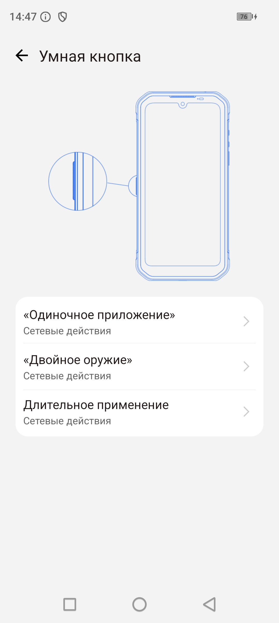 С правой стороны корпуса размещаются кнопки управления громкостью и включения смартфона, а с левой установлен лоток сим-карт и дополнительная функциональная кнопка. Дополнительная кнопка позволяет в зависимости от количества нажатий настроить запуск определенных программ или действий. Все настройки из меню операционной системы, как настройка второго экрана. На нижней грани основной динамик и разъем зарядки.