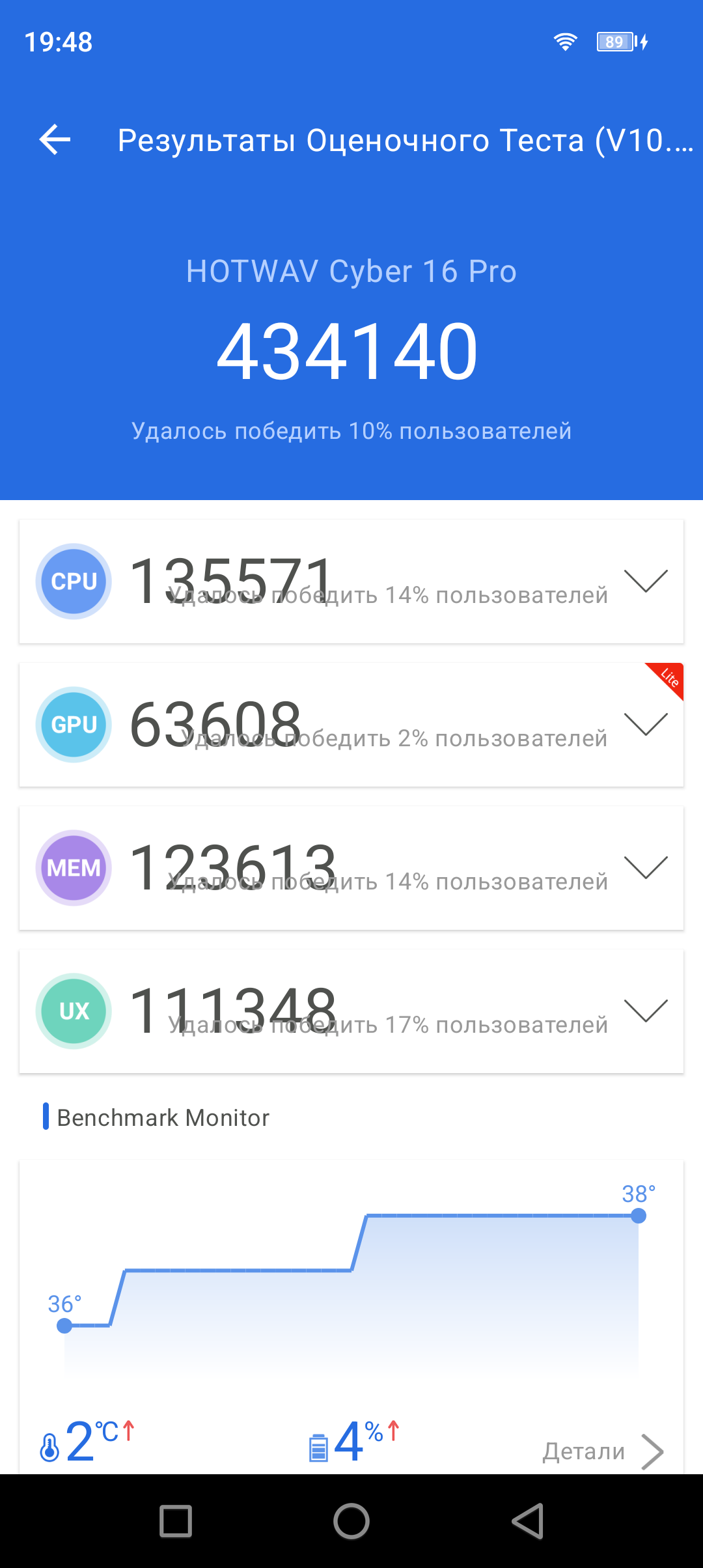 Процессоры MediaTek Helio G99 и MediaTek Helio G100 почти идентичны, поэтому разницы в количестве очков Antutu минимальное. Напомню, что Hotwav Cyber 15 набирал 428-430 тысяч очков, но при этом количество оперативной памяти было 12 Гб. Hotwav Cyber 16 pro набирает 427-434 тысячи очков, что примерно также.