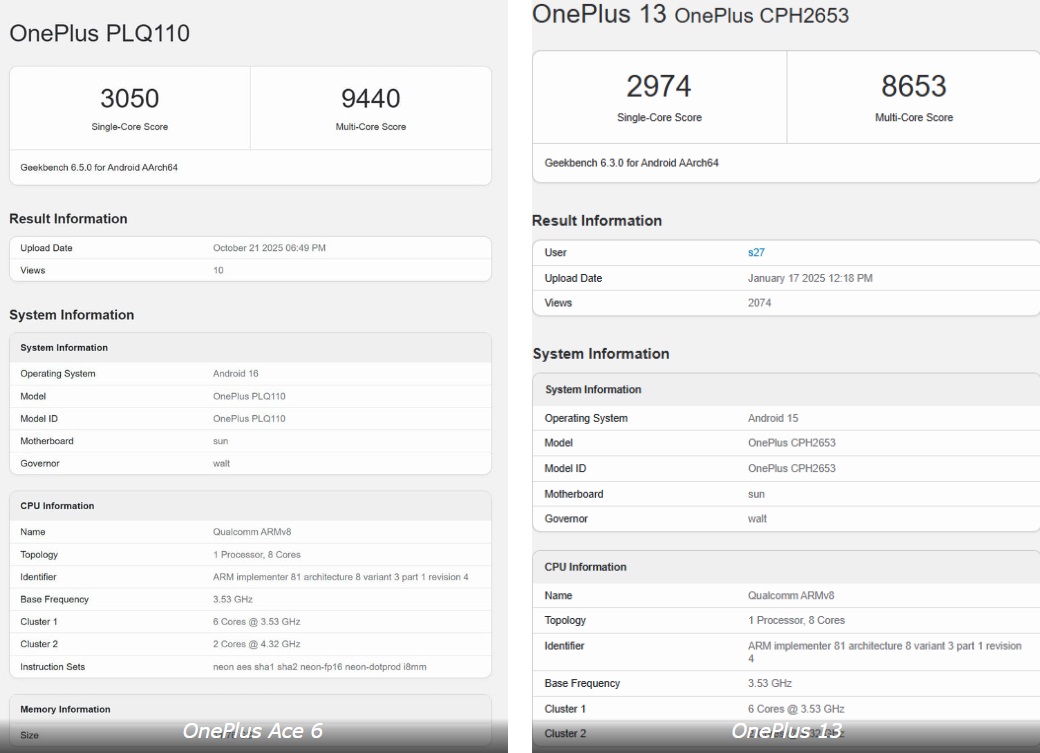 Ace 6, идентифицируемый по номеру модели PLQ110, был протестирован в Geekbench 6 с чипсетом Qualcomm Snapdragon 8 Elite, тем же самым, на котором работает прошлогодний флагманский OnePlus 13. С этим процессором Ace 6 достиг результата в 3050 баллов в одноядерном тесте и 9440 баллов в многоядерном. Это ставит его практически вровень с OnePlus 15 и немного выше результата OnePlus 13 в многоядерном тесте (9369 баллов). Данные незначительные расхождения в производительности связаны с версией программного обеспечения, а не с какими-либо аппаратными ограничениями.