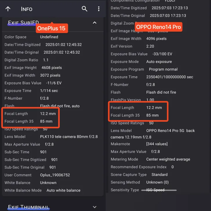 Анализ метаданных показал, что фактическое фокусное расстояние телеобъектива составляет 12,2 мм с кроп-фактором 6,9X, что идентично характеристикам OPPO Reno14 Pro. Это подтверждает использование одинакового сенсора в обоих устройствах. Также выяснилось, что оба смартфона применяют цифровую обрезку изображения с 80 мм до 85 мм, что соответствует фактическому коэффициенту обрезки 6,6X для сенсора Samsung JN5.