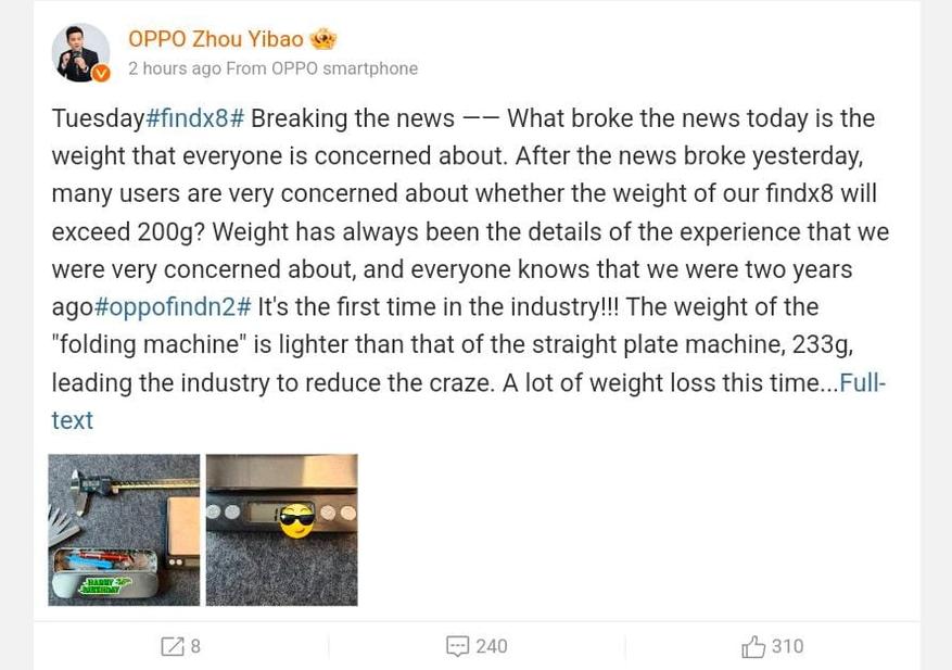 В своем сообщении на Weibo он отметил, что Oppo Find N2 стал одним из первых устройств, сосредоточившихся на стратегиях уменьшения веса. Компания применяет аналогичные подходы для снижения веса в линейке Find X8. Ожидается, что не только базовая модель, но и версии Find X8 Pro и Find X8 Ultra будут легче, чем предполагалось ранее.