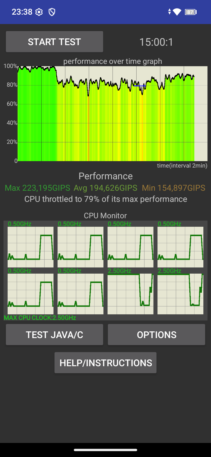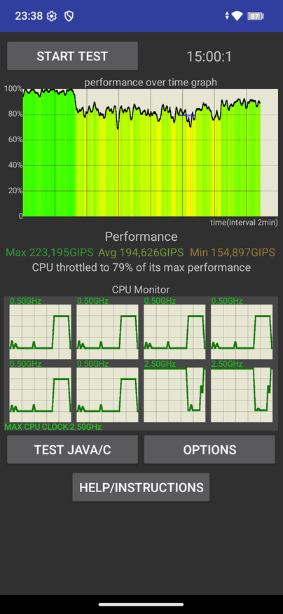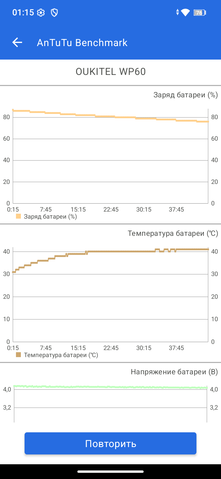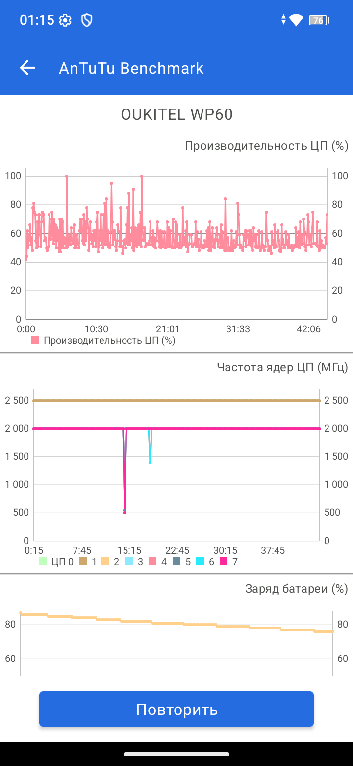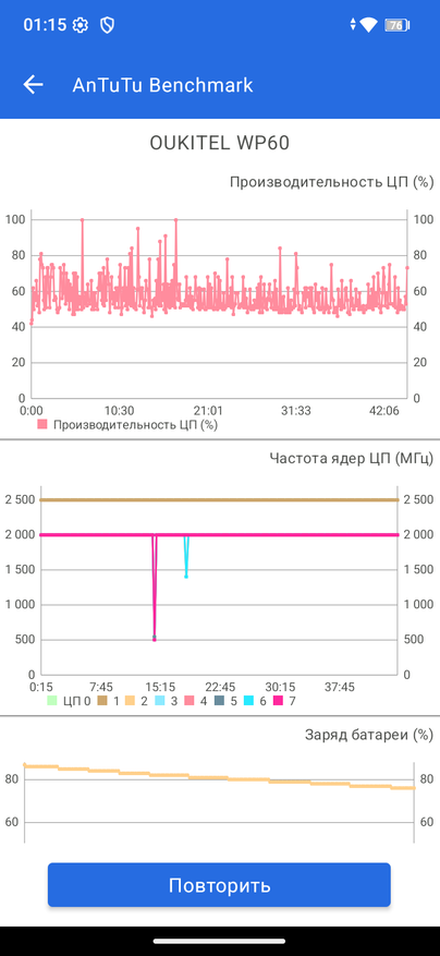 В стресс-тестах производительность снижается, но без критических провалов. CPU Throttling Test показывает падение примерно до 80%, при этом среднее значенее GIPS находится на приемлемом среднем уровне. Смартфон не перегревается и работает стабильно, но ждать от него флагманской мощности очевидно не стоит. Отдельно удивляет мультитач всего на три касания — странное решение для такого большого дисплея.