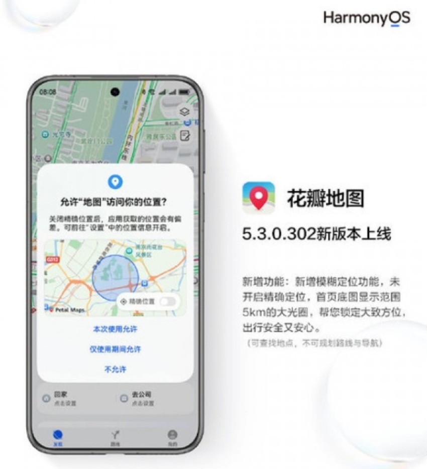 Кроме того, в новом обновлении появилась опция неточного геопозиционирования. При ее активации, приложение отображает приблизительное местоположение пользователя в виде круга с радиусом около 5 километров. Эта функция, направленная на повышение конфиденциальности, ранее реализованная Google в Android, теперь доступна и в Petal Maps.