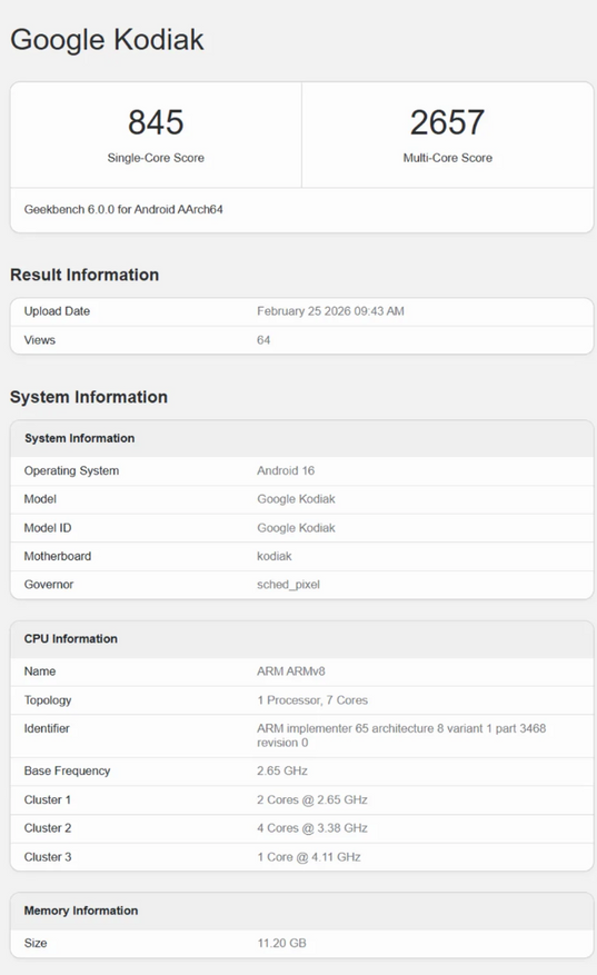 Сведения с Geekbench не раскрывают официального названия нового устройства, однако оно идентифицируется кодовым названием «Google Kodiak», как и Pixel 10 Pro XL. В опубликованных результатах указаны параметры процессора: одно главное ядро для максимальной производительности, несколько высокопроизводительных ядер для ресурсоемких задач и несколько энергоэффективных ядер, отвечающих за выполнение фоновых процессов и экономию энергии. Объем ОЗУ составляет 12 ГБ, при этом указан обновленный графический процессор, который заменяет предыдущую версию, использовавшуюся в Tensor G5.
