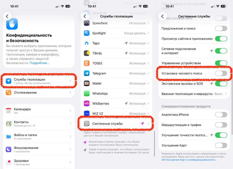 Если вам важно, чтобы будильники и календарь работали как часы, сделайте две вещи: зафиксируйте часовой пояс вручную и отключите «Установку часового пояса». С помощью этого вы уберете «прыжки» времени, даже если геолокация ведёт себя странно.