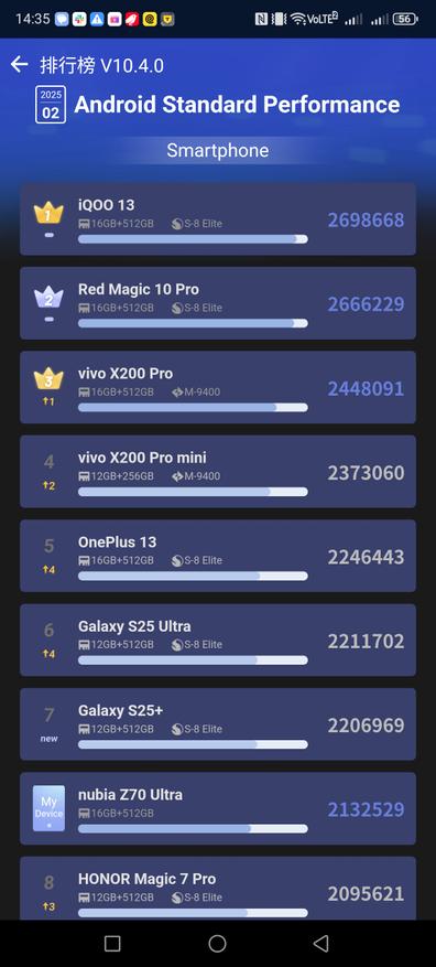 Такое явление, известное как «троттлинг», знакомо пользователям флагманов не понаслышке. Вопрос лишь в том, насколько сильно снижается производительность и как быстро это происходит. В случае с S25 Ultra результаты неоднозначные. В популярном бенчмарке AnTuTu смартфон показывает около 2,2 миллиона баллов, что относит его к нижней части списка устройств на данном процессоре. Это не самый худший результат, но и до лидеров, например, игровых смартфонов IQOO и Red Magic, ему далеко.