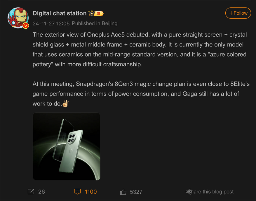 Смартфон получит чистый прямой экран, защищенный стеклом Crystal Shield, и будет заключен в металлическую среднюю рамку и керамический корпус. Ожидается, что OnePlus Ace 5 выйдет в цветовом варианте Sky Blue с уникальной отделкой из крашеной керамики, выполненной с использованием передовых технологий.