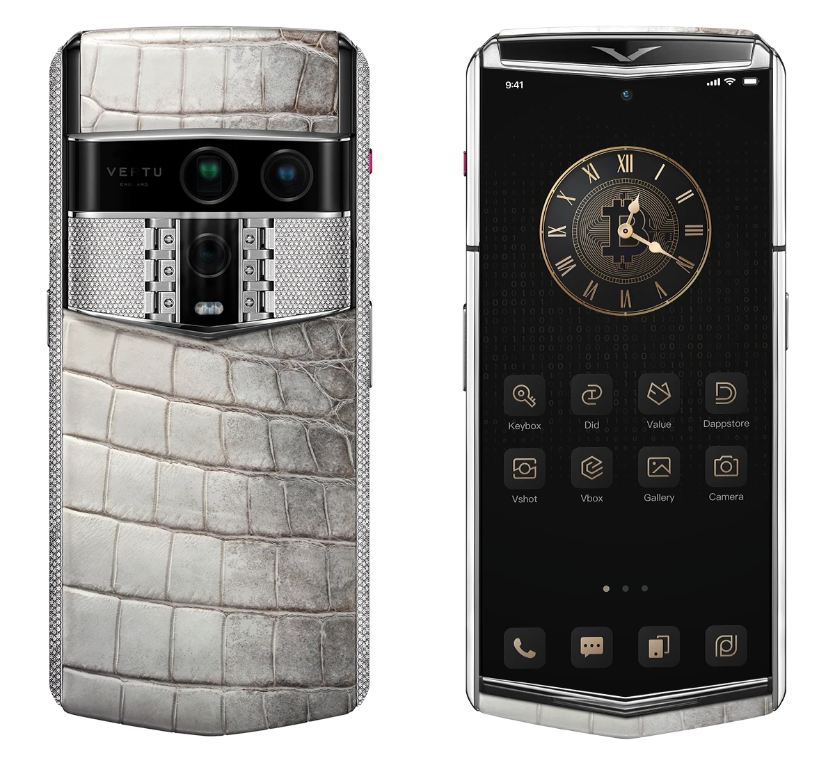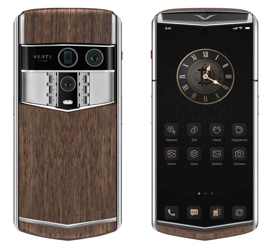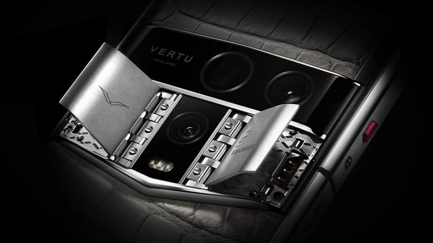 Отдельного упоминания, конечно же, стоят материалы. Внутренняя рама сделана из стали, а компоненты покрыты золотом для защиты от окисления. Снаружи смартфон выделяется металлической рамкой и спинкой, выполненной из кожи крокодила, кожи телёнка или натурального орехового дерева. В самом дорогом варианте задняя часть дополнительно украшена россыпью бриллиантов. Под камерами можно увидеть традиционный для Vertu элемент в виде откидных «крыльев сокола», но если раньше под ними прятались слоты для карточек, то сейчас их практическое назначение неизвестно.